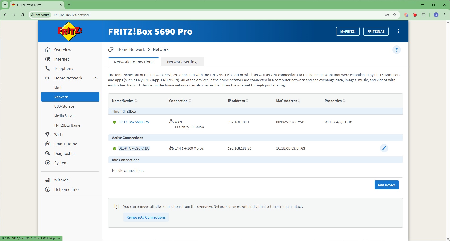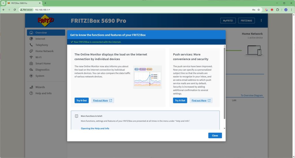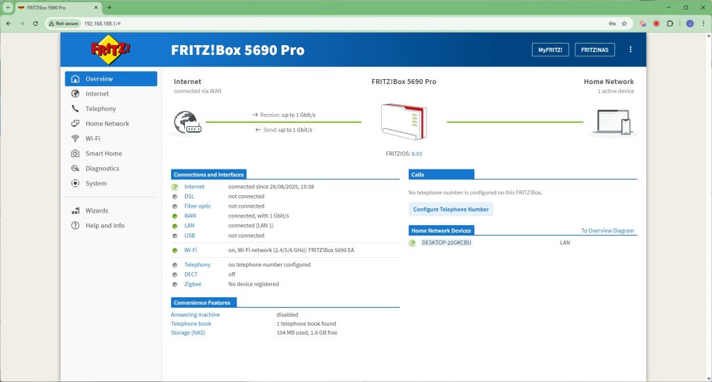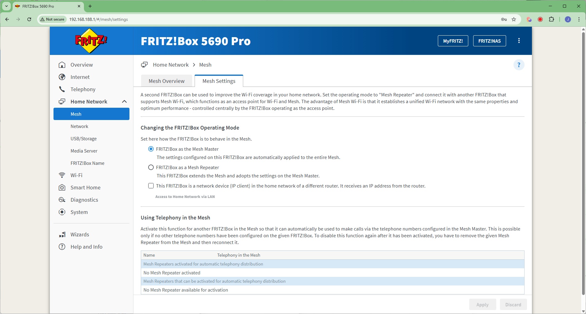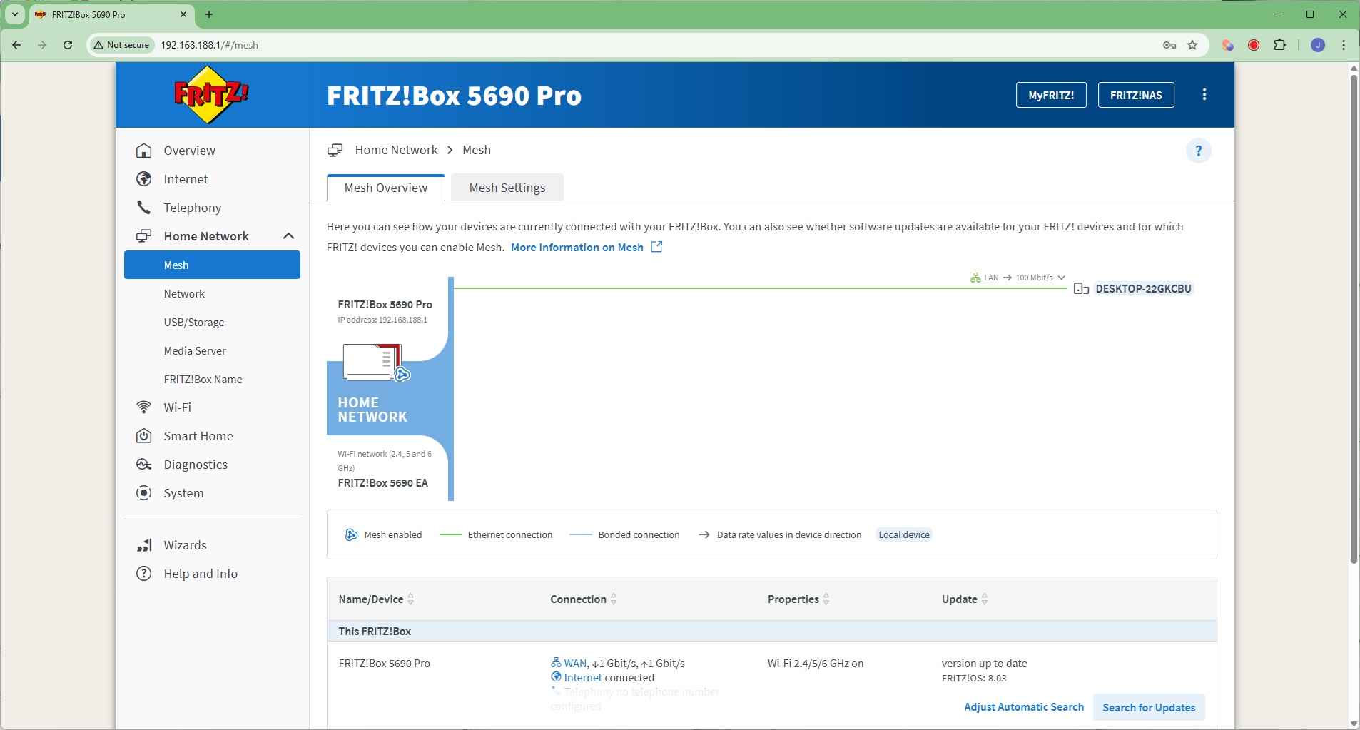Next, we get to the Home Network section, where you can create a Mesh with multiple FRITZ! devices, connected either wirelessly as repeaters or over wired LAN (including via powerline networking).