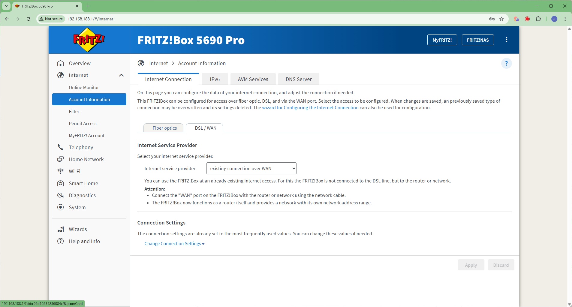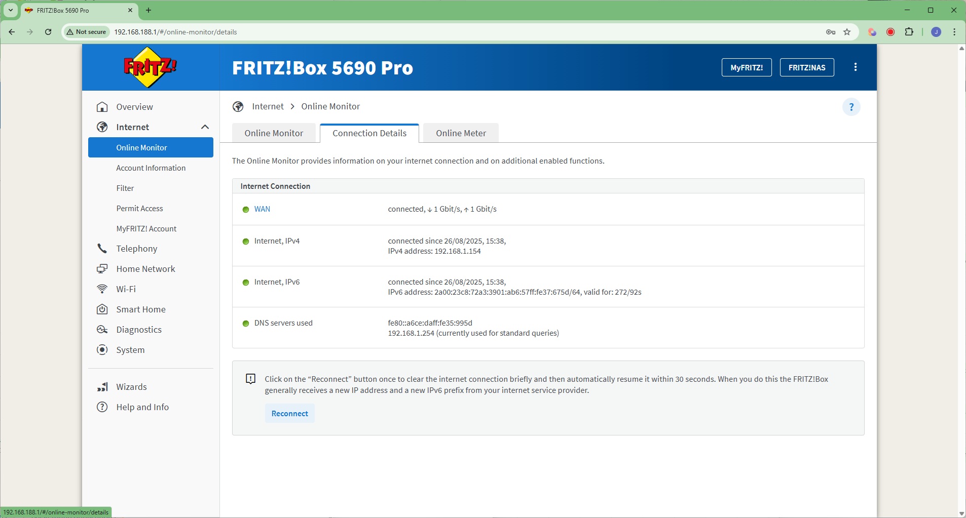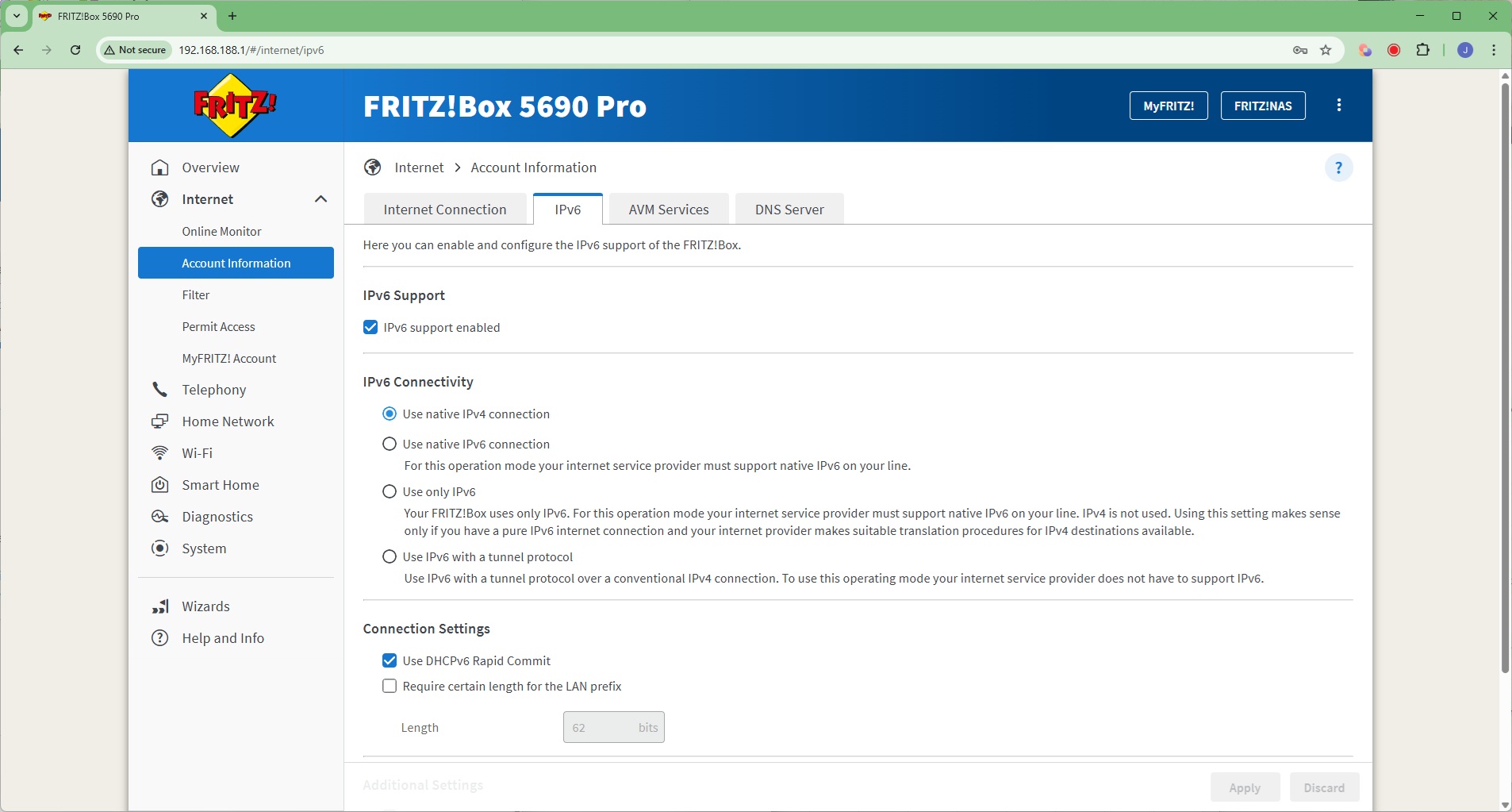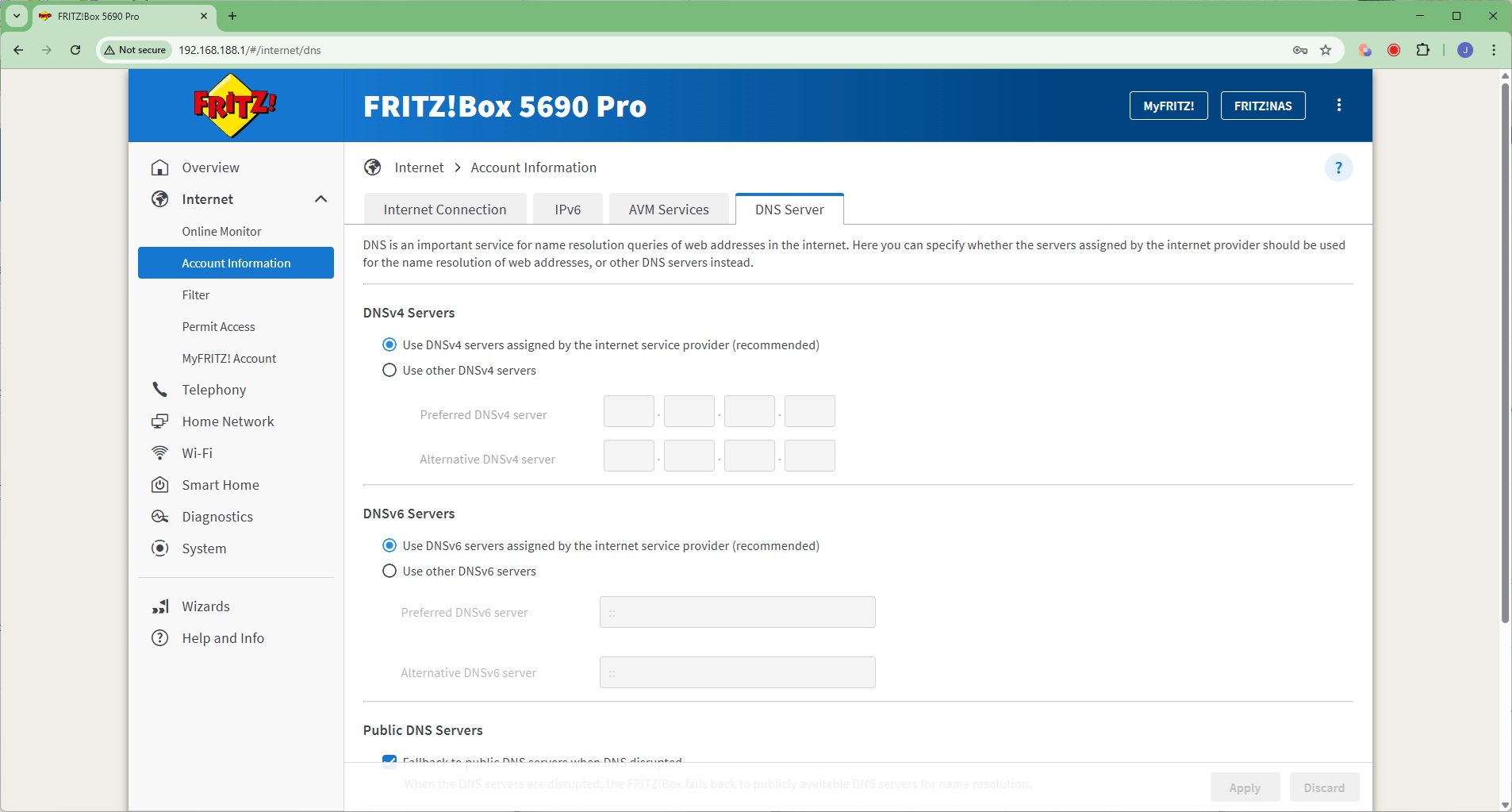 Next along under Account Information is where you can reconfigure your Internet Connection, change your IPv6 support, alter whether the router checks for updates and sends diagnostics to AVM, and enter a static DNS server rather than the dynamically provided one.