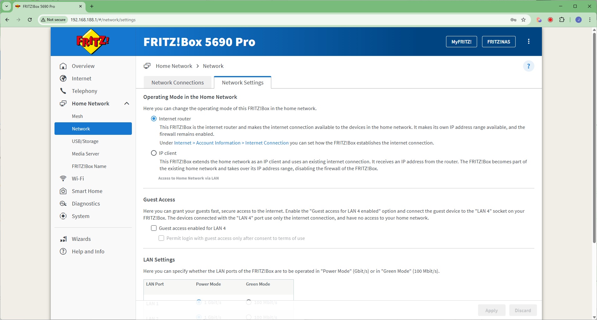 The Network section lets you browse which devices are on the network, and configure the speed of the various LAN ports. You can also choose whether the 5690 Pro acts as a router (which supplies its own IP addresses) or an access point (which doesn't).