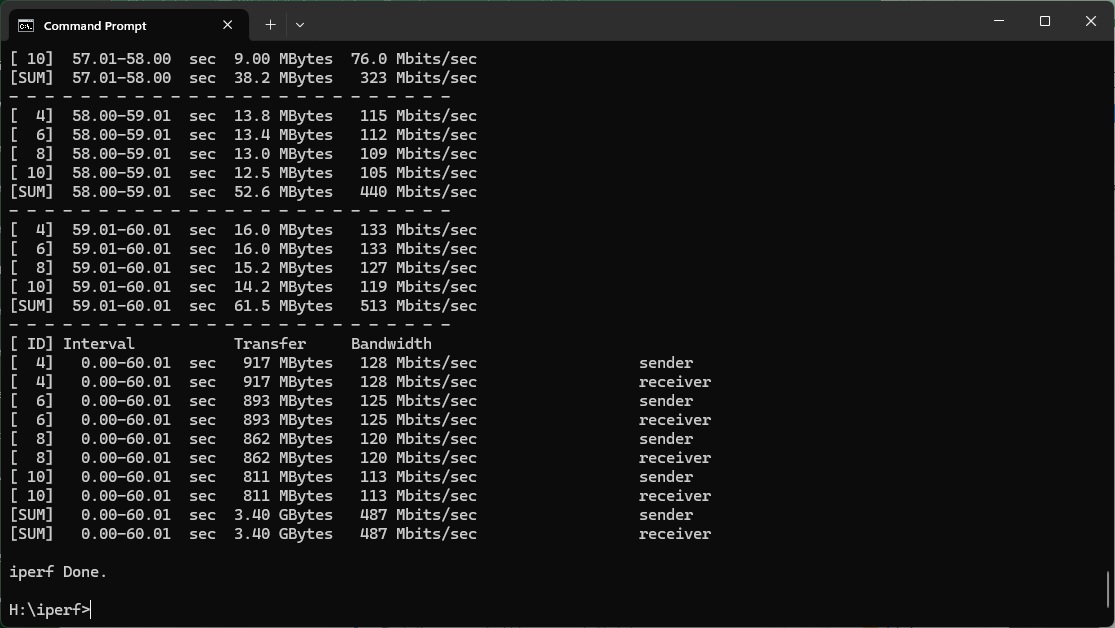 We used the open-source iPerf 3.1.3 software for testing, which can simulate multiple clients streaming at once. Five Windows systems were employed. Our desktop base was an Armari 32-core AMD Ryzen Threadripper workstation running Windows 11. For WiFi 7 testing, we used an Acer Swift 14 AI notebook, then a Dell XPS 17 notebook (for WiFi 6), a fourth was an MSI WS63-7RK (802.11ac) notebook, and finally an HP Folio 3 notebook (802.11n only – to show performance with legacy devices). The Acer and Dell notebooks and Armari workstation were running Windows 11 but the other two notebooks were Windows 10-powered.