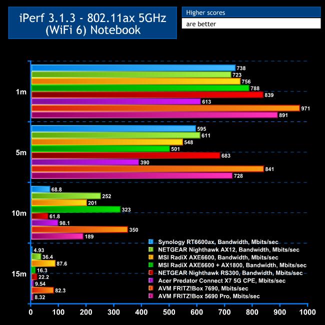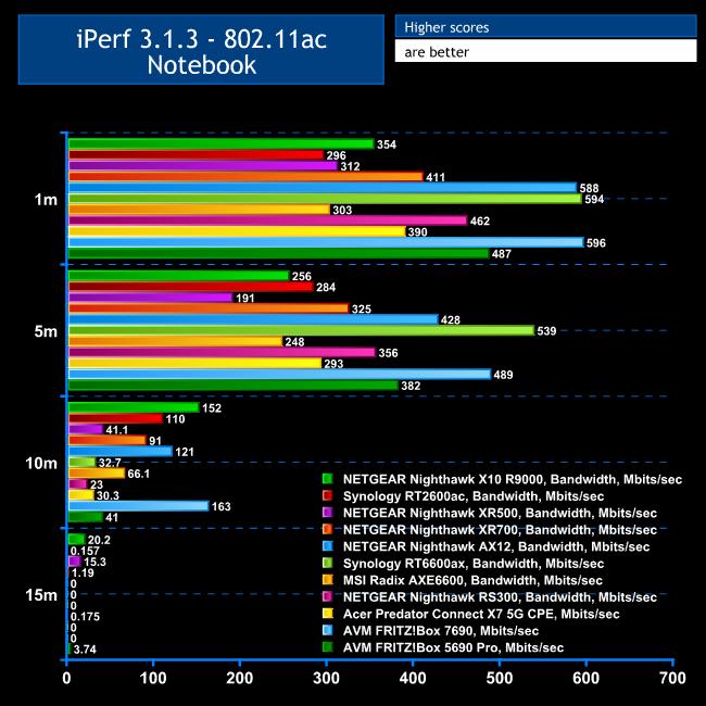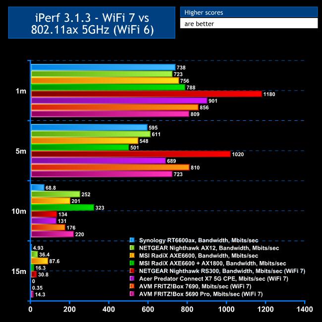 However, things improved at 5m. The FRITZ!Box 5690 Pro's 723Mbits/sec is ahead of the Acer Predator X7 5G CSE, but still behind the 7690 and the NETGEAR Nighthawk RS300 is cruising way out in front.