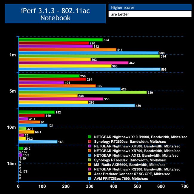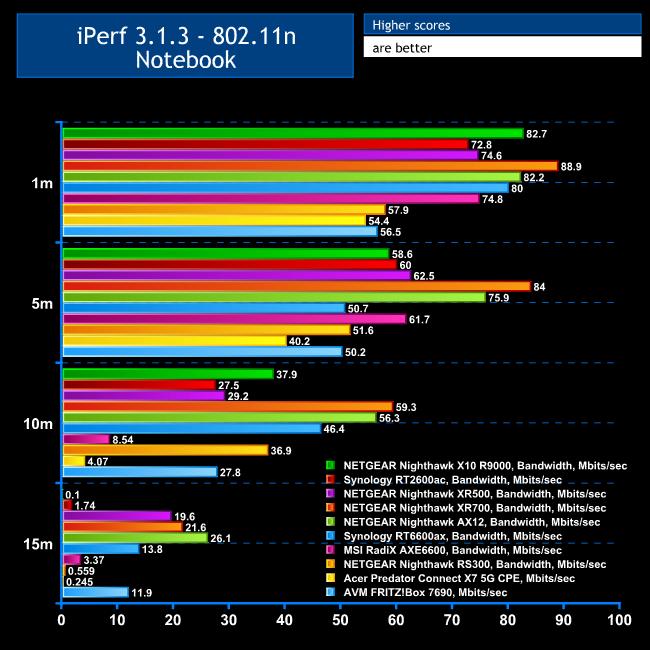 With each WiFi standard and distance, we took 60 readings of throughput at one second intervals and calculated the average (iPerf does this automatically). We tested the FRITZ!Box against the MSI Radix AXE6600, NETGEAR Nighthawk X10 R9000, Synology RT2600ac, NETGEAR Nighthawk XR500, NETGEAR Nighthawk XR700, Synology RT6600ax, NETGEAR Nighthawk AX12, NETGEAR Nighthawk RS300 and Acer Predator Connect X7 5G CPE.