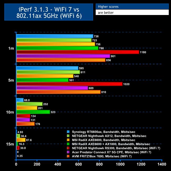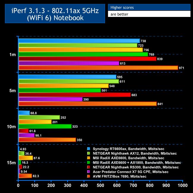 Only at 15m does the MSI RadiX AXE6600 go past the FRITZ!Box, but the 7690 is still managing a very usable 82.3Mbits/sec.