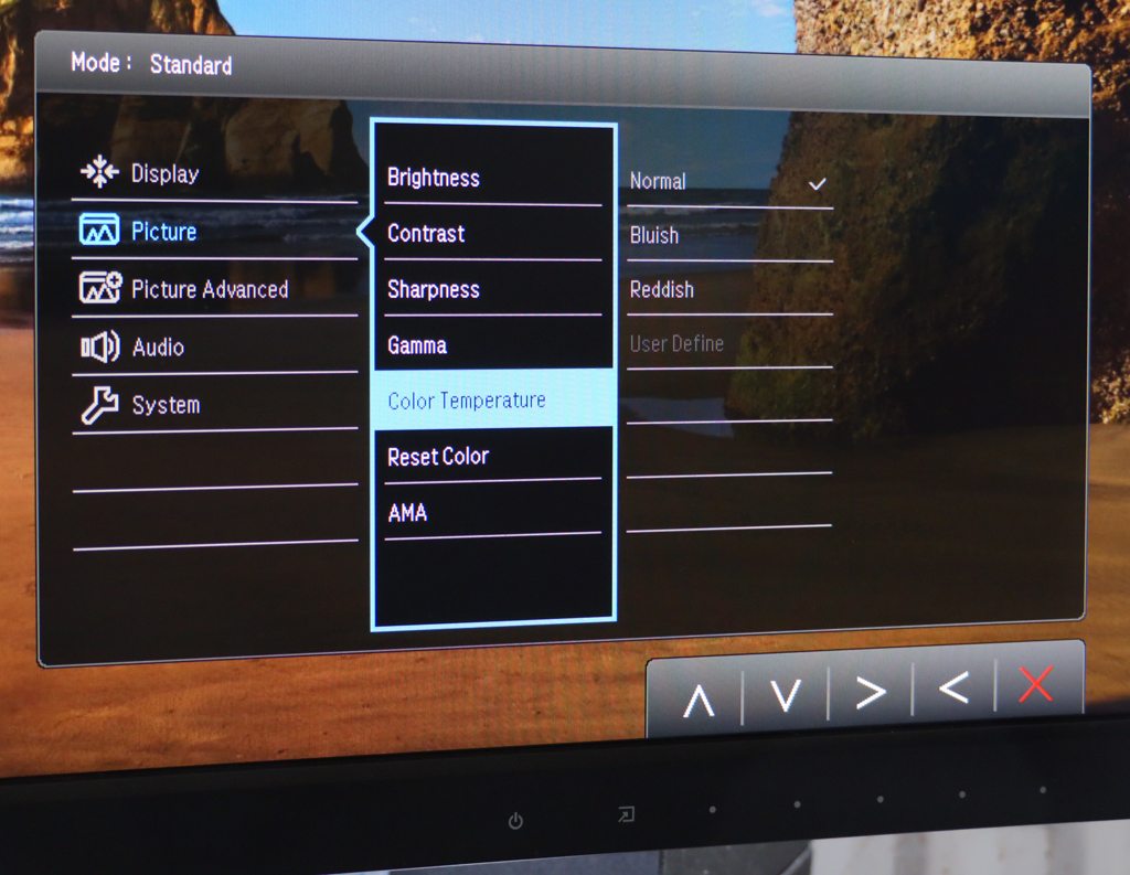 The Picture submenu provides alternative access to Brightness, a conventional Contrast control, Sharpness, Gamma with 5 presets, and Color Temperature. However, the latter offers three presets – Normal, Bluish and Reddish – with no direct control over equivalent K value. The User Define setting, which only comes into play when using a Custom Preset, enables RGB sliders rather than K values.