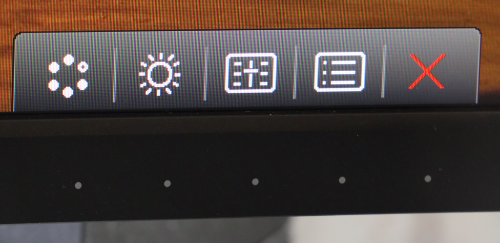 The row of buttons on the bottom of the screen are indicated by icons and grey dots. The button corresponding to the power button also doubles as the LED indicating whether the screen is on or not, although it's a little hard to press. You can cycle between inputs easily with the button next door, however.