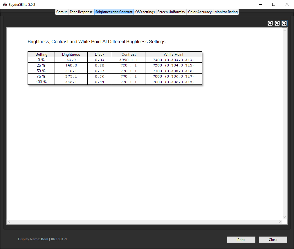 - A monitor’s contrast ratio at various brightness levels in the OSD.