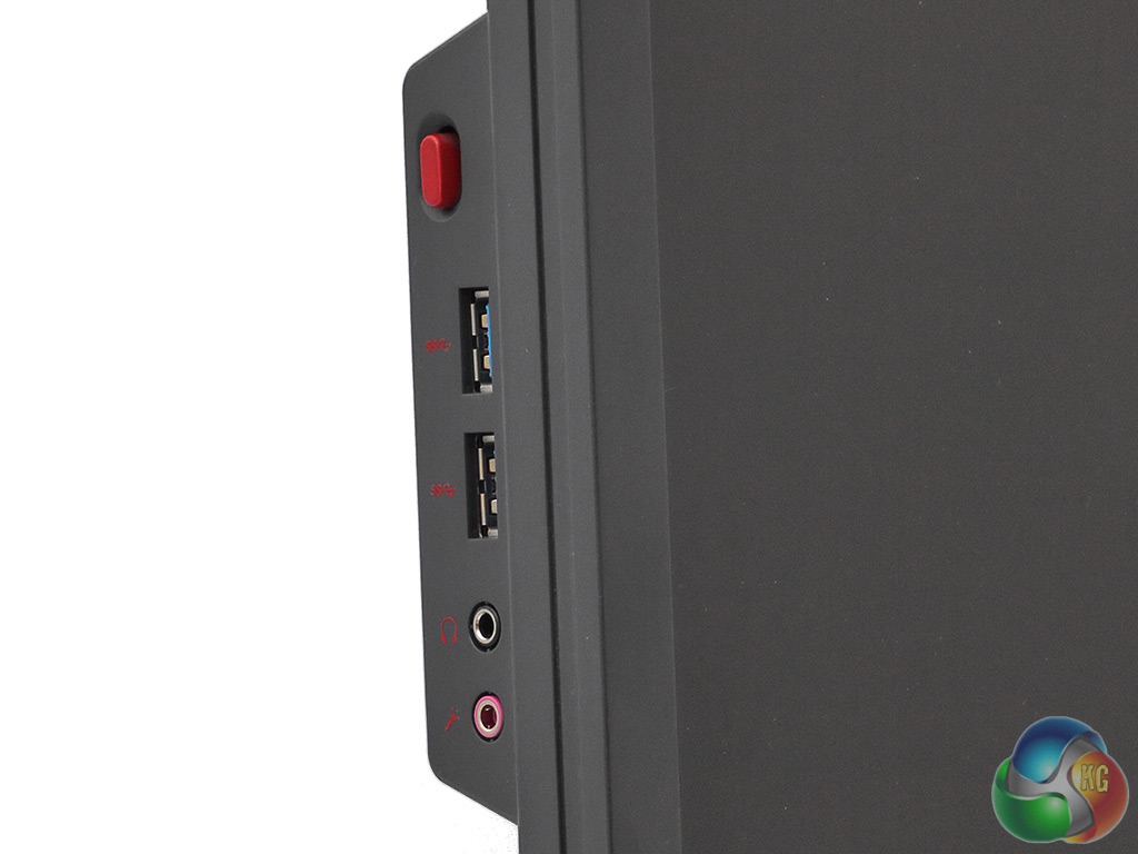 There’s also a curious red button above the USB ports, the use of which isn’t immediately obvious. Does it switch the functionality of the USB ports in some way, or mute the audio? Actually, it’s not a button at all, but slides out to provide a hanger for your headphones. AOC’s AGON screens provide something similar, and it’s a very welcome touch.