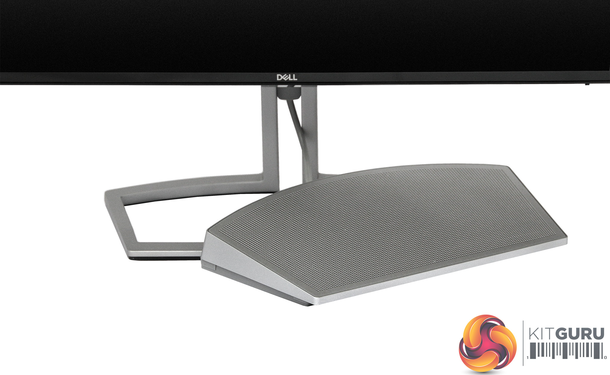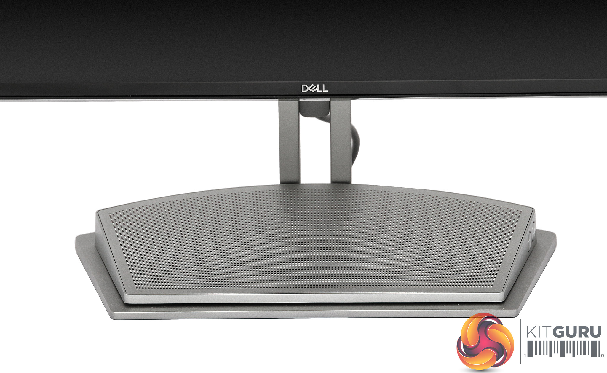 The 12W speaker system comes in a separate module that slots into the base of the stand. There's a proprietary DIN connector that attached to the rear of the screen. The speakers can then receive audio from HDMI or the analog minijack, and there are physical volume controls on the side.