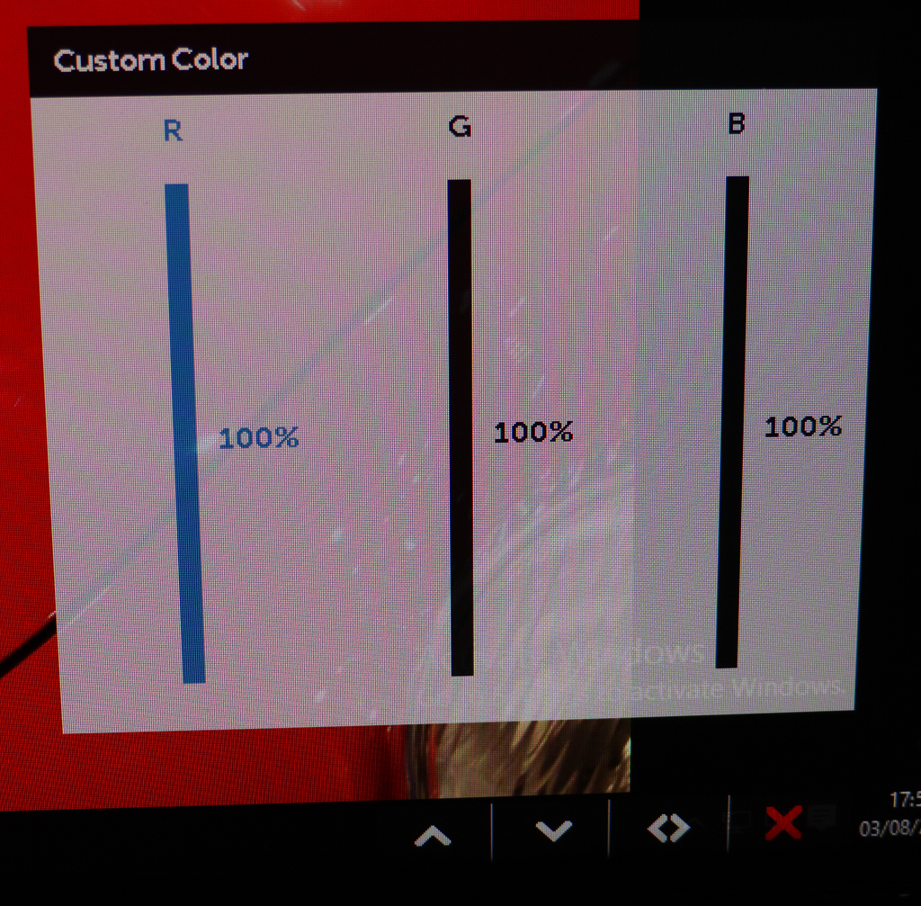 The colour temperature menu offers settings from 5,000K to 10,000K, although only 5,700K, 6,500K, 7500K, and 9,300K are available. It’s not a continuous range. The custom option lets you adjust red, green and blue from their default 100 per cent maximums down to zero in single per cent increments.