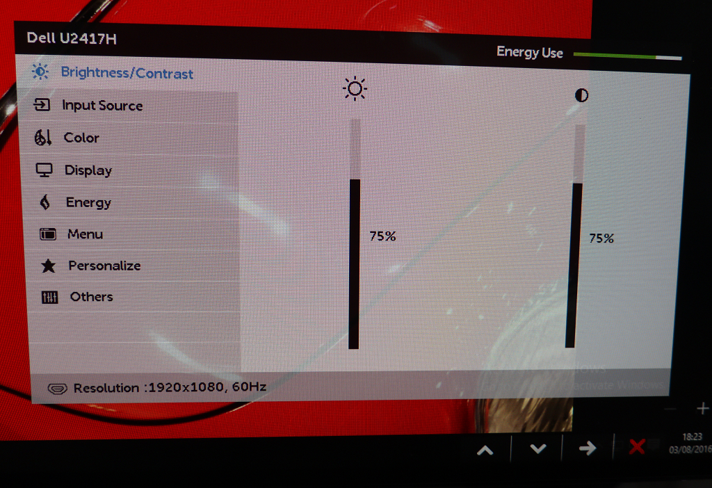 The meat of the settings are to be found in the main menu, with a particular neat inclusion being the energy use meter in the top right-hand corner of this menu. The initial screen shows general controls for brightness and contrast, followed by another route to changing the input.