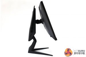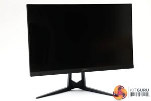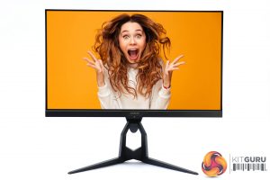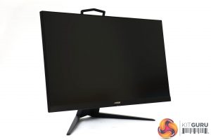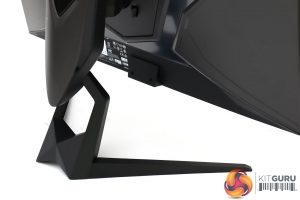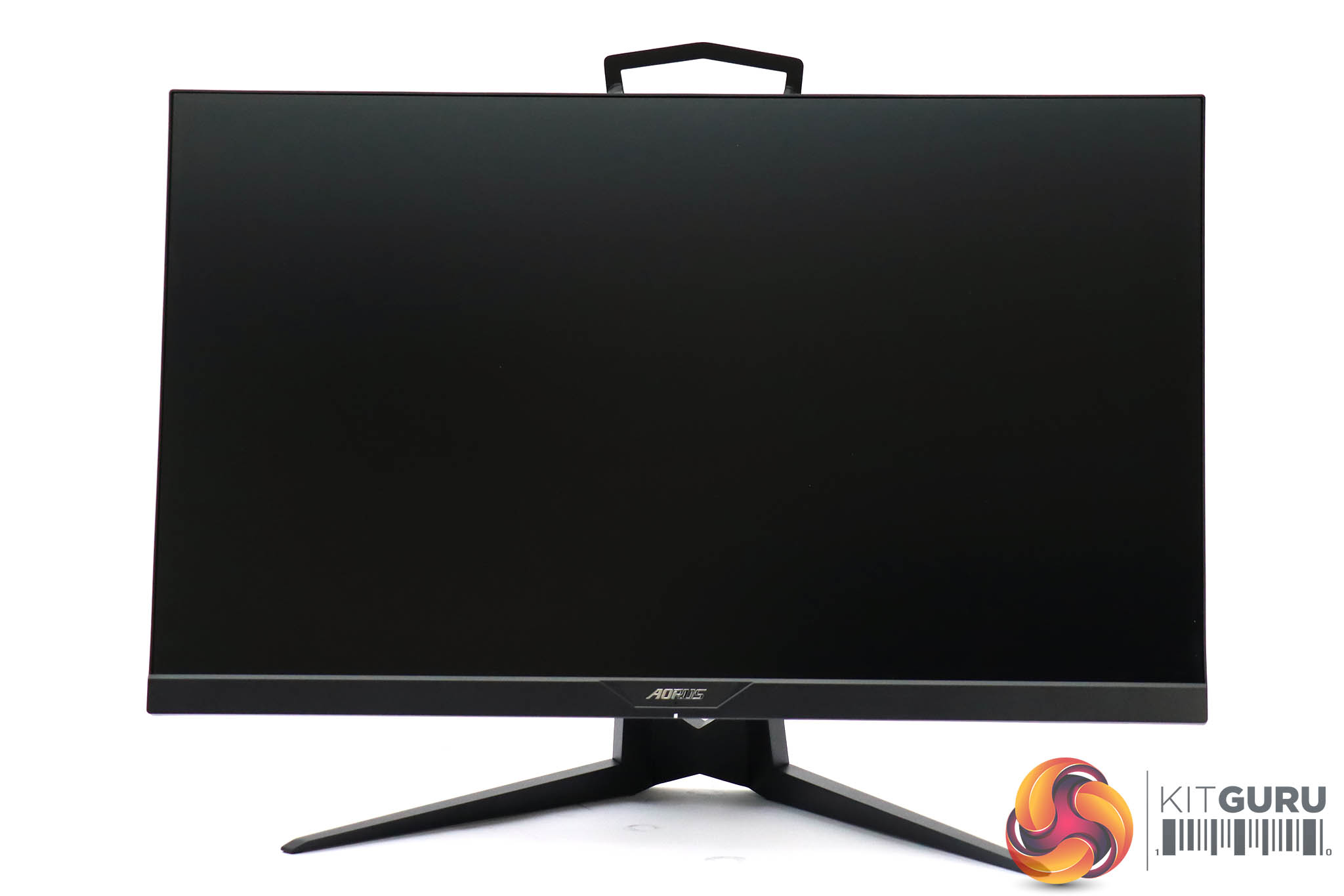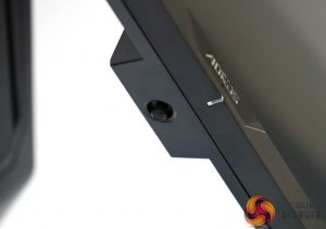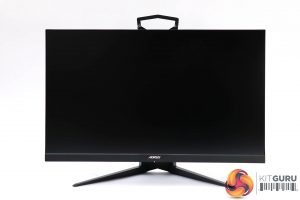 Apart from the AORUS-branded bottom edge, this screen has a very slim bezel, which adds to the style factor. From the front, only black is visible, and the rear looks decidedly dark as well. But when the screen is on, there are plenty of LED lighting options to brighten things up. The AORUS eagle logo is illuminated, as are diagonal flashes towards the top right and left corners.