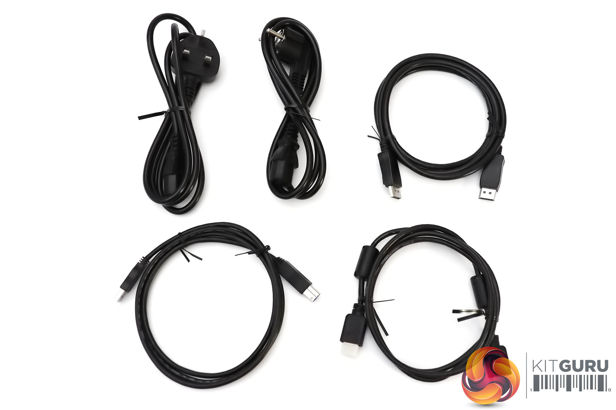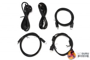 The box is black and stylish, evoking the contents. Inside you get HDMI, DisplayPort and USB upstream cables, plus power cords for the UK and Europe.
