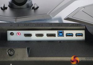There's a decent array of connectivity available. You get two HDMI 2.0 video inputs, plus a single DisplayPort 1.2. There's a USB 3.0 hub with single upstream and two downstream ports. The latter may seem miserly, but we're guessing you lose a couple because the screen actually uses USB for audio, which is why it can offer a microphone input jack as well as headphone output.