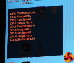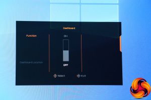 Now if you push the joystick left, you get the Dashboard options. This will put PC information such as CPU temperature and frequency up in the top left of your screen (although you can change this). You can choose what to display, too. However, this only works if you have the USB upstream connected and the OSD Sidekick application installed and configured. You also need to be using Gigabyte components including graphics card and motherboard to get much more than the CPU frequency displayed.
