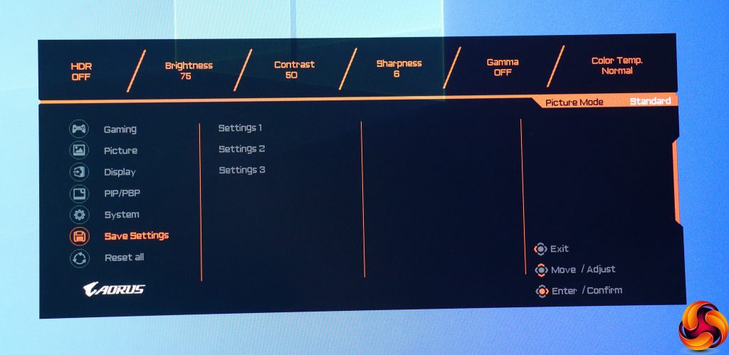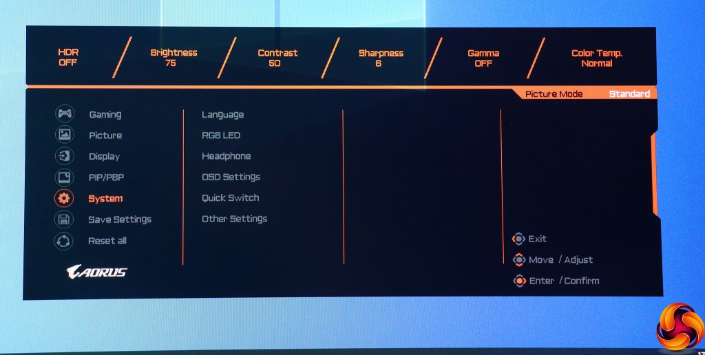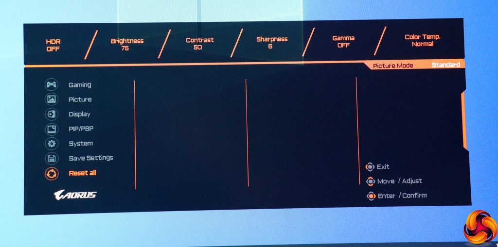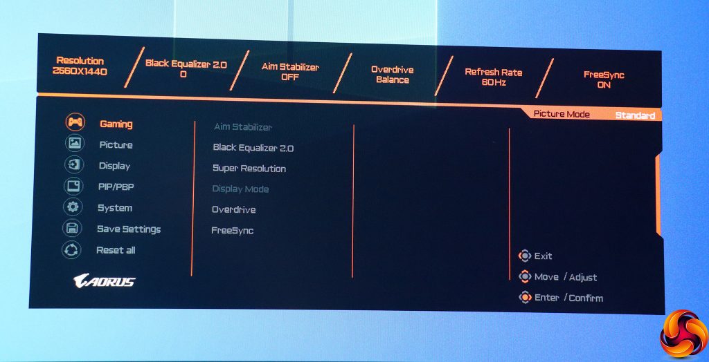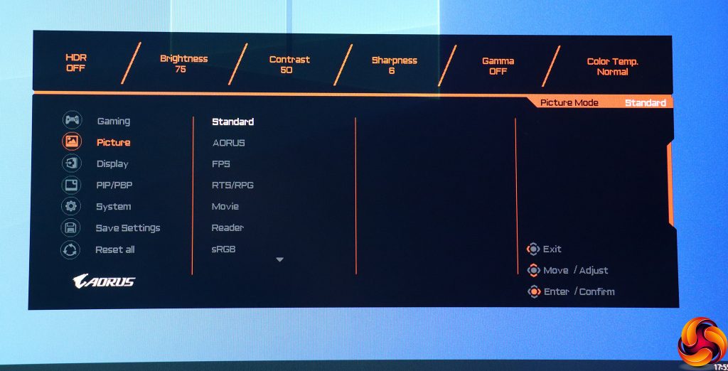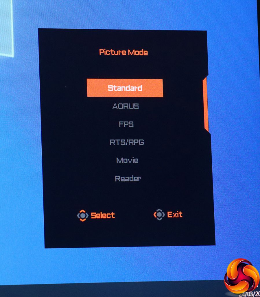 Pulling the joystick towards you calls up a menu for the Picture Modes. These include the default Standard, plus a mysterious AORUS option, FPS, RTS/RPG, Movie, Reader, sRGB, and three user-configurable Custom slots.