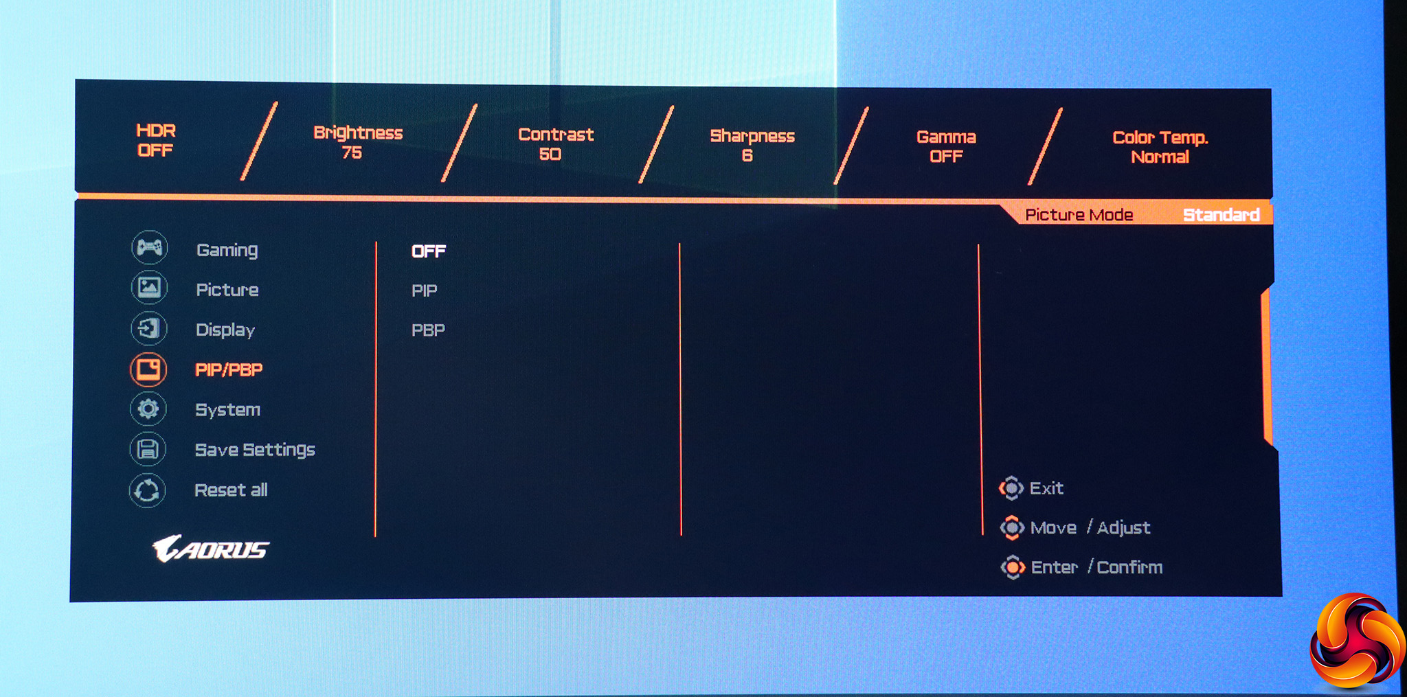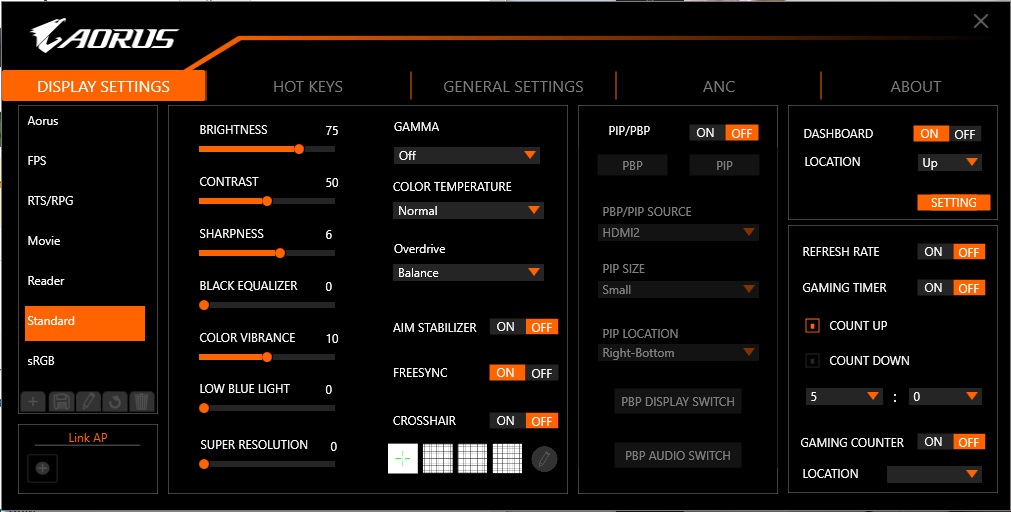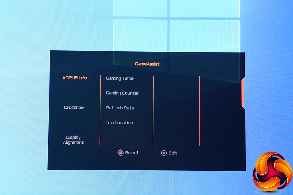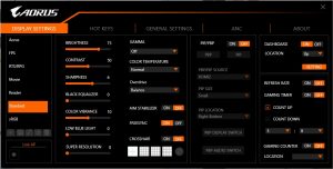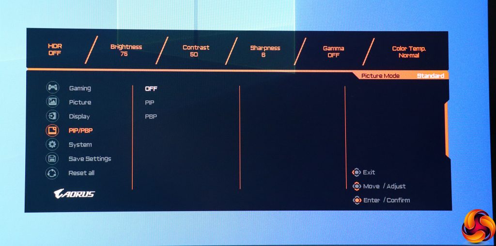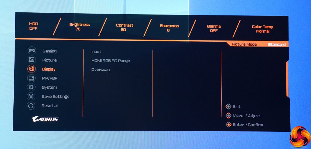 Pulling the joystick towards you calls up a menu for the Picture Modes. These include the default Standard, plus a mysterious AORUS option, FPS, RTS/RPG, Movie, Reader, sRGB, and three user-configurable Custom slots.