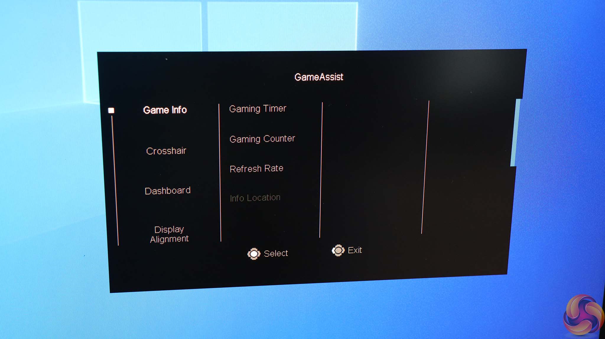 Pushing the joystick upwards calls up the Main Menu, with the Gaming section the first to appear. This provides access to the aforementioned Black Equalizer, Super Resolution (a sharpness / upscaling option), pixel Overdrive, and the option to toggle AMD FreeSync Premium adaptive synchronisation. There is also a setting to turn on the Aim Stabilizer, but this is not selectable at default settings.