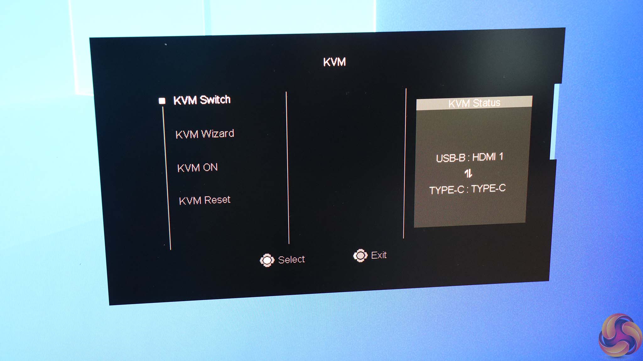 Now, if you push the joystick left, you reveal some settings for the KVM system, including a setup wizard for the two slots. Although the neatest system is when you have a portable that can deliver video, data and receive charge over USB C, but some only have a subset of this, and as already said the M27Q's power output is only enough for a tablet. The ones we tried only offered data and video. Some only offer data, so you will have to use one of the other video inputs alongside USB C, which is possible.