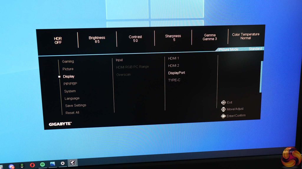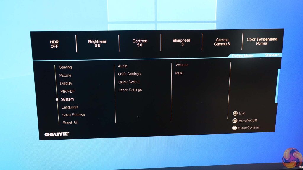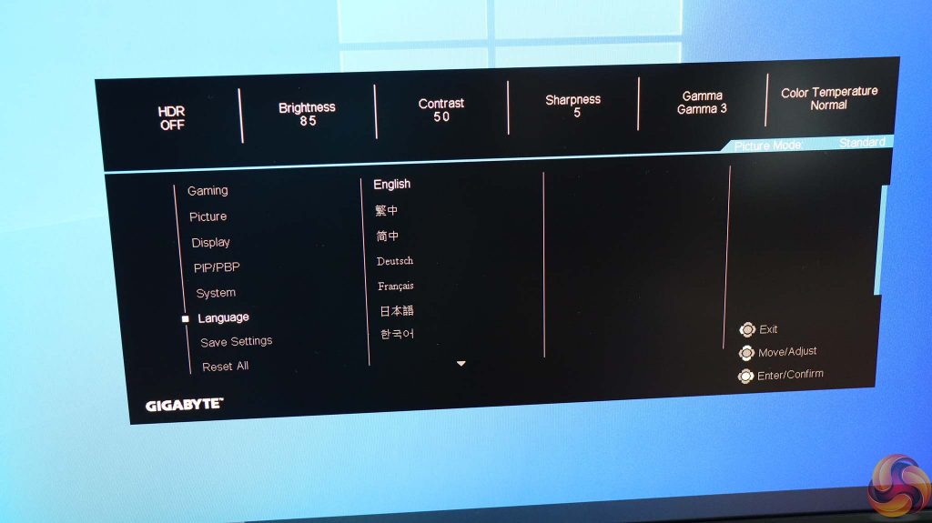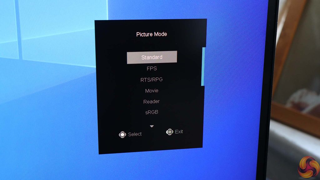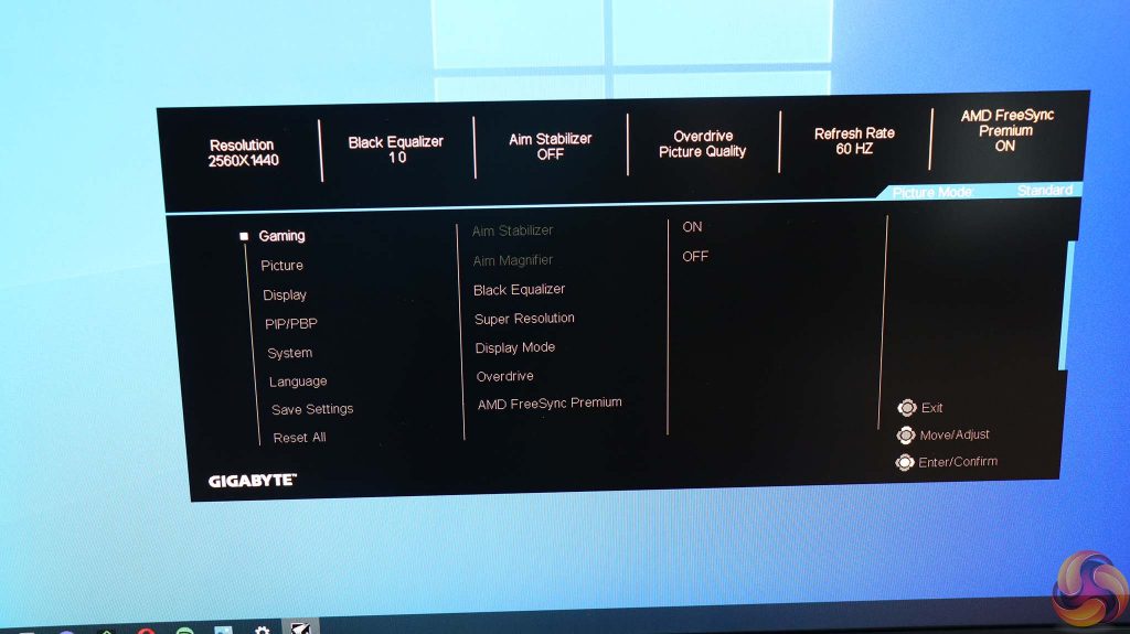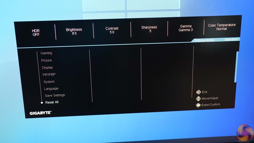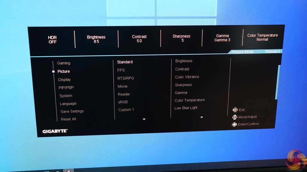 Finally, pushing left lets you select the Picture Modes. Unlike some manufacturers, Gigabyte groups all of these together, whether game-related or aimed at more general usage scenarios. The options include Standard, FPS, RTS/RPG, Movie, Reader, sRGB, and three Custom slots where you can save your settings.