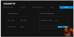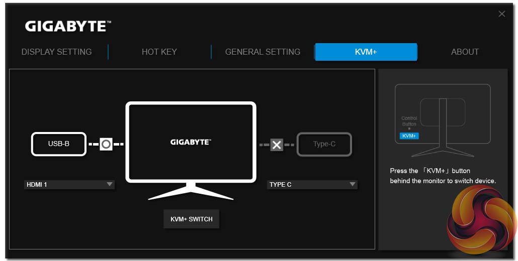 You can also control the monitor through Gigabyte's OSD Sidekick Windows software. This provides most of the same features, but grouped slightly differently. The KVM configuration is particularly useful, making it easy to combine each USB input (Type B and C) with a video input of your choice. This software also provides the ability to update the monitor firmware.