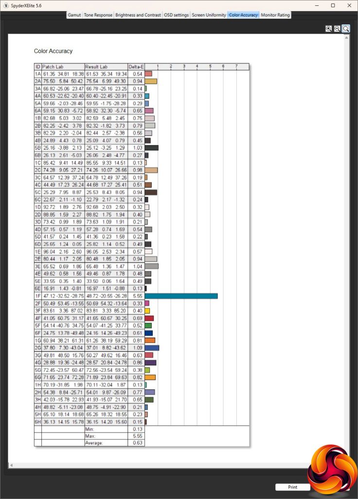 The colour accuracy is superb out of the box, with a 0.63 average deviation. Only one blue shade appeared to be dramatically deviant. But as always, we fired up the SpyderX again to see if calibration could improve things any further. The only adjustment suggested during the process was dropping the brightness level by 1 per cent.