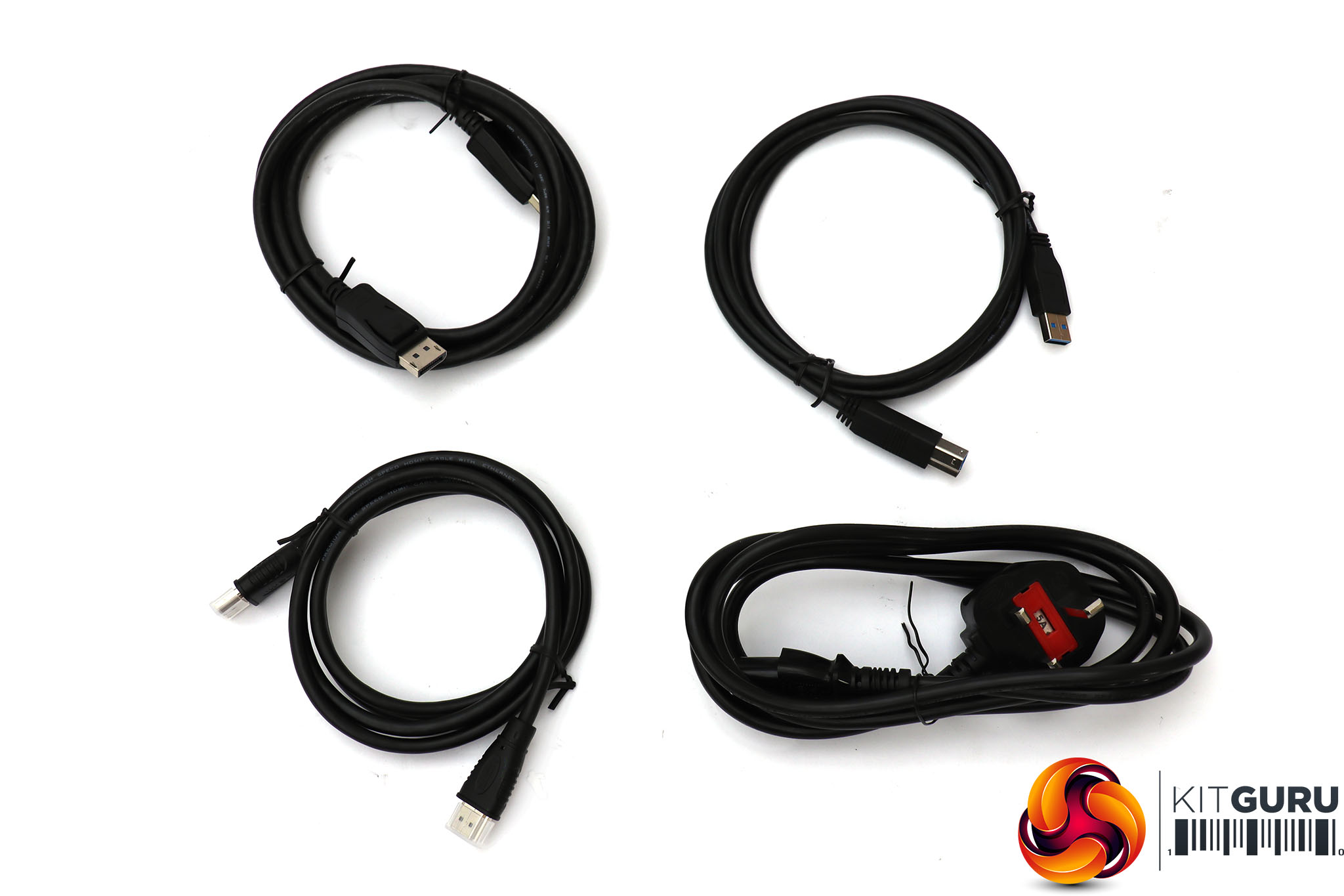 Inside, you get HDMI and DisplayPort cables, a USB upstream cable, and the usual power cord.