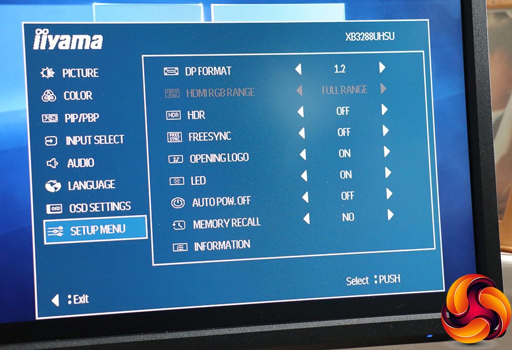 Finally, all the sundry other options can be found in the Setup Menu, including changing the format support of the DisplayPort input, the RGB range for an HDMI input, and turning on HDR. You can also enable support for AMD FreeSync, configure whether the Iiyama logo appears when you turn the monitor on, and whether the power LED is lit. You can configure the monitor to turn itself off automatically after a certain period of time, and reset everything to default. The information section tells you details of the current video input signal.
