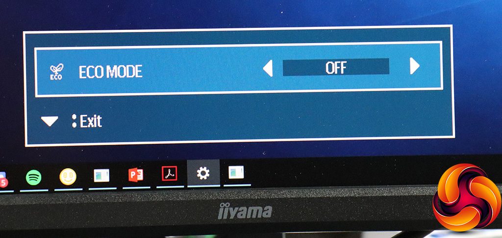 Pushing the joystick left lets you choose one of the three levels of Eco Mode, although the default is off. For some reason, the quick menus revealed by pushing the joystick left and right appear in the middle bottom of the screen rather than the bottom right corner.