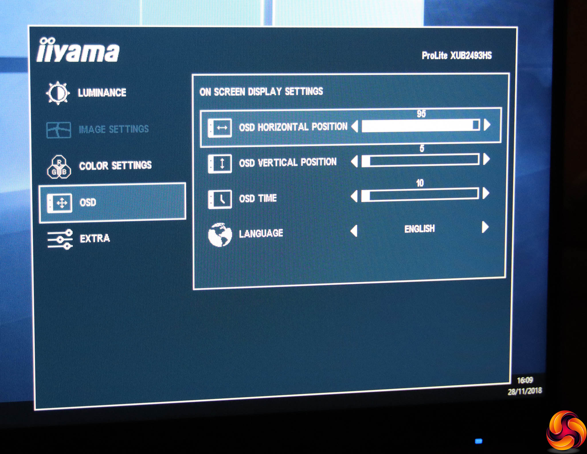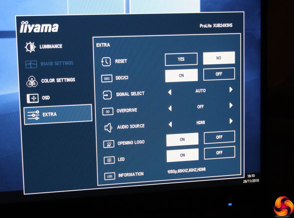 Finally, the Extra section includes all the options that didn't fit elsewhere. You can reset to factory defaults, toggle DDC/CI control, and choose the video signal input manually. There's an option to overdrive the pixels to improve on the relatively slow response of IPS panels, and you can also manually select the audio source rather than using the current video input. There are also sundry settings for whether the screen shows the Iiyama logo when it turns on and whether the LED power light comes on.
