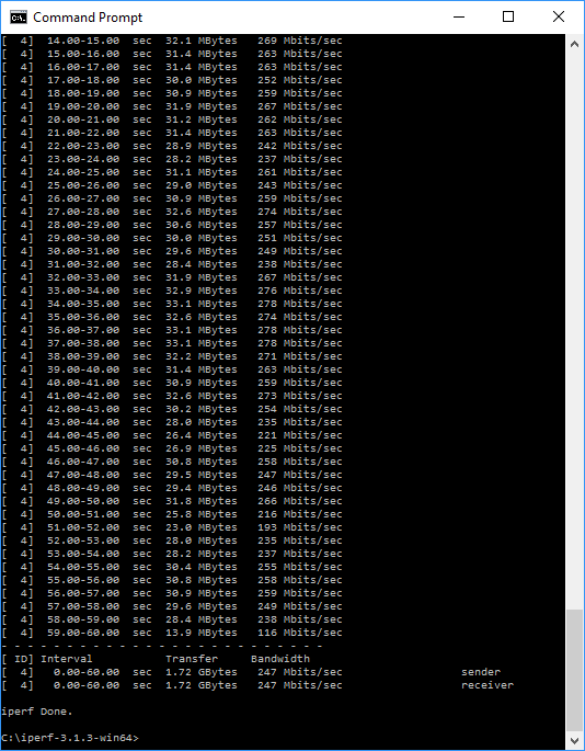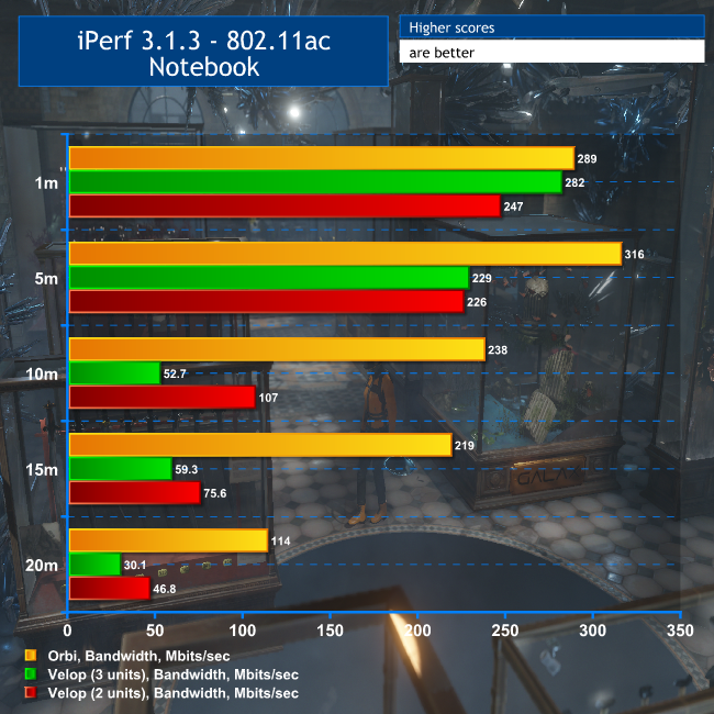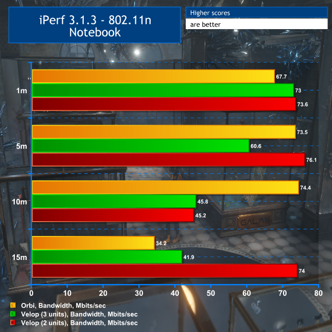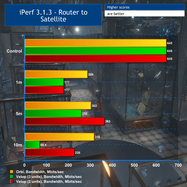 In each case we took 60 readings of throughput at one second intervals and calculated the average (iPerf does this automatically). We are also comparing the Velop's performance with the NETGEAR Orbi. Note that for the wireless tests the Orbi's satellite was at the same 10m distance as the Velop's second satellite.