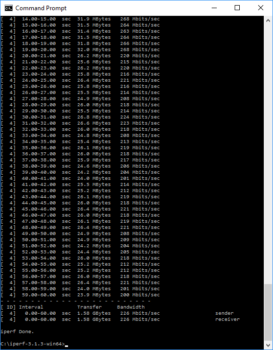 We tested the Linsys Velop in a very similar fashion to the previous review. First, we wanted to assess the raw throughput of the “backhaul” connection between the two satellites, then the wireless throughput for client systems. For both tests we used the open-source iPerf 3.1.3 software and three Windows 10 systems (HP Folio 13 and HP Spectre 13 X2 notebooks, plus a self-built Intel Core i7 workstation). For the backhaul test, the HP Folio 13 and workstation were connected via Gigabit Ethernet, the workstation to the router and Folio 13 to a satellite. The two Velop satellites were placed at about 1m away in the same room and 5m on the same floor, and then about 10m on a lower floor respectively. These tests were performed in a regular four-bedroom London terraced house – narrow but going back quite a bit towards the rear.