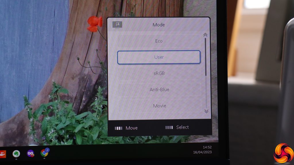 The third button along, with an arrow pointing left, calls up the Mode presets. Aside from the default User option, these include Eco, sRGB, Anti-Blue, Movie, Office, and Black-White. Note that there are no gaming-focused presets here, because that's not the target audience for this screen.