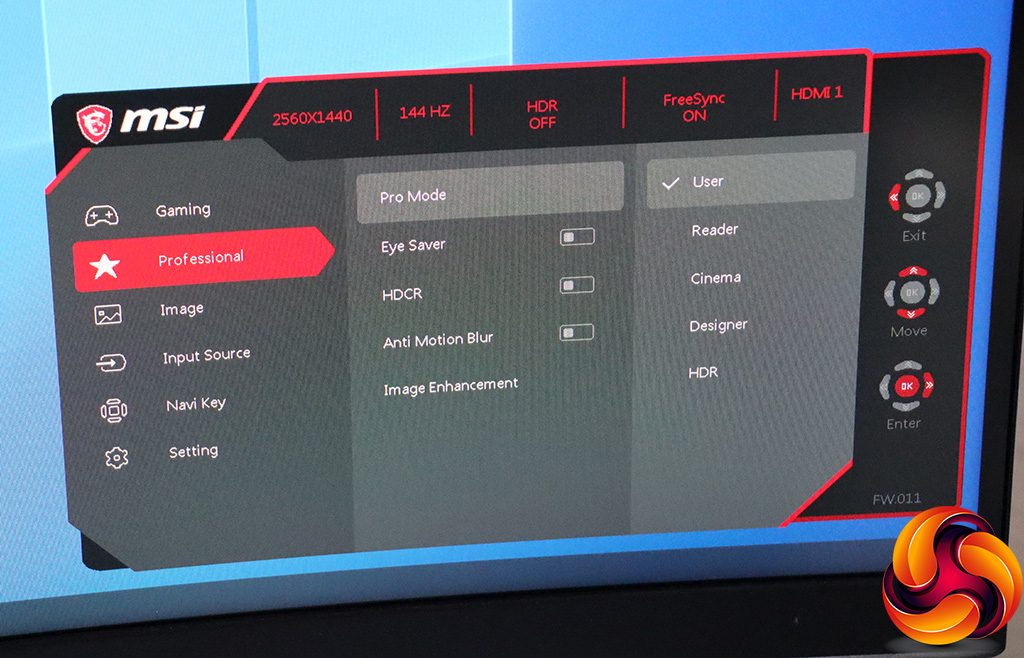 Next down is the Professional submenu, where again we see MSI separating gaming presets from the everyday usage scenarios. In this area, you can choose between User-configurable, Reader, Cinema, Designer and HDR. Eye Saver is a low blue mode to guard against strain, although it only has an on-off switch, not multiple levels.