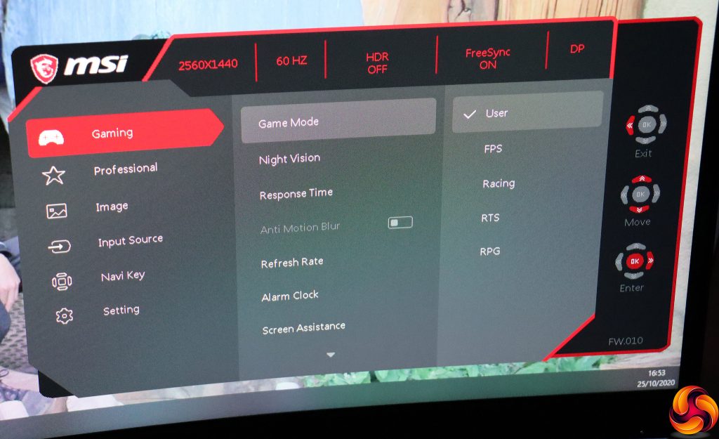 If you push the joystick in, you get the main menu, with the Gaming section being the default first submenu. This includes another route towards the Game Mode presets. You can turn on Night Vision, which brightens dark areas automatically. Under Response Time, you can choose between Normal, Fast and Fastest. There's the option to toggle Anti Motion Blur (depending on input type), and you can display the refresh rate onscreen. You can also call up the alarm clock / timer from this menu, as well as the Screen Assistance crosshairs. Scroll down one more notch and you will find the ability to toggle FreeSync.