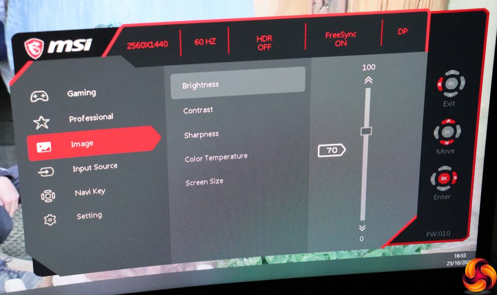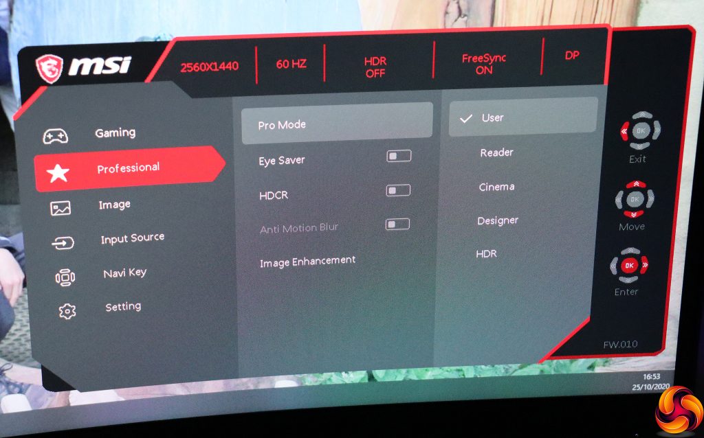 MSI has grouped some serious work settings into the Professional submenu. Here you can find the Pro Modes, which are presets for non-gaming activities including Reader, Cinema, Designer and HDR. There's an Eye Saver option (for reducing eye strain-causing blue light), high dynamic contrast range (HDCR), anti motion blur (again, if the input settings allow it), and Image Enhancement. This is a sharpening system with four levels above off.