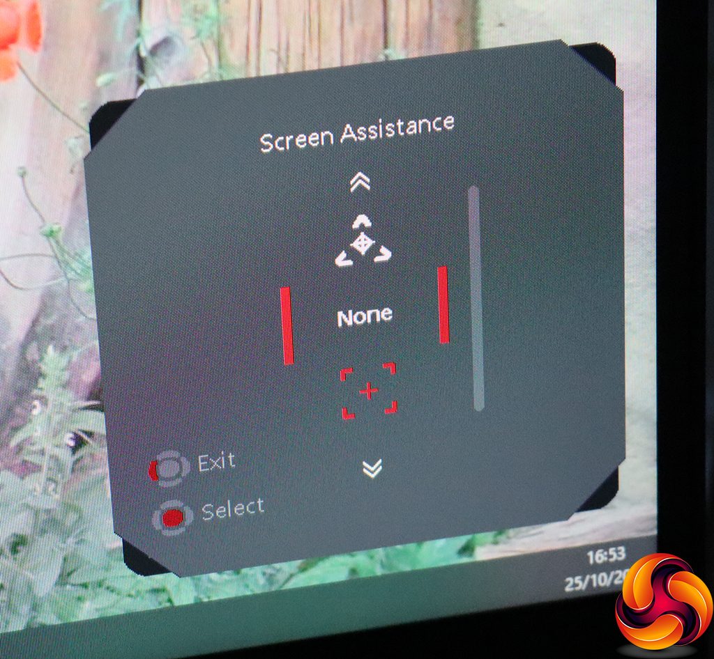 Finally, pulling the joystick down reveals the “Screen Assistance” menu, where you can enable a range of hardware crosshair types, which you can use when practicing your skills.