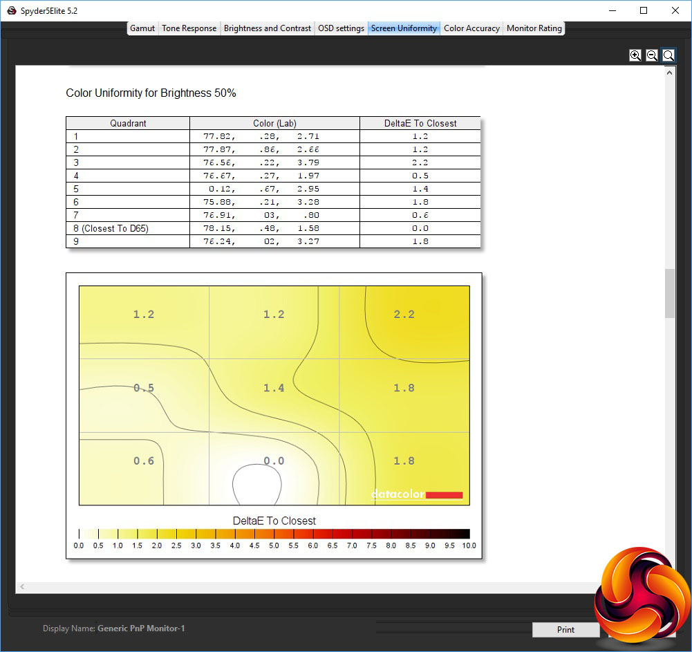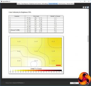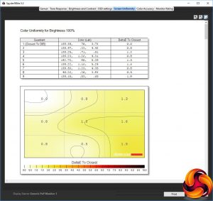 Brightness uniformity is poor, with difference percentages into double figures on all sides and corners except in the middle at the bottom.