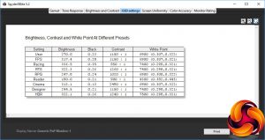 Racing mode is even brighter at 336.5cd/m2, but uses lower 950:1 contrast and a cooler 7400K white point. The RTS option uses the same white point, but a slightly less bright 322.3cd/m2 and higher 1,260:1 contrast. RPG mode uses the same 6900K white point as User and FPS modes, but a much less bright 247.8cd/m2 and lower 1,020:1 contrast.