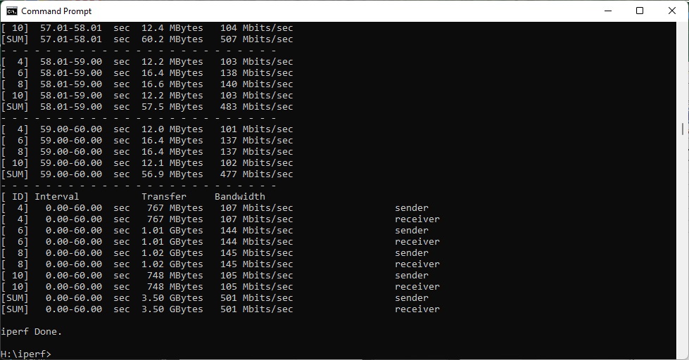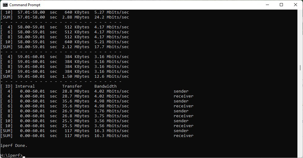 At 15m the 6GHz signal is weaker, so we only saw 18.2Mbits/sec versus 87.6Mbits/sec. This is still usable, but implies that 6GHz doesn't have the range of 5GHz.