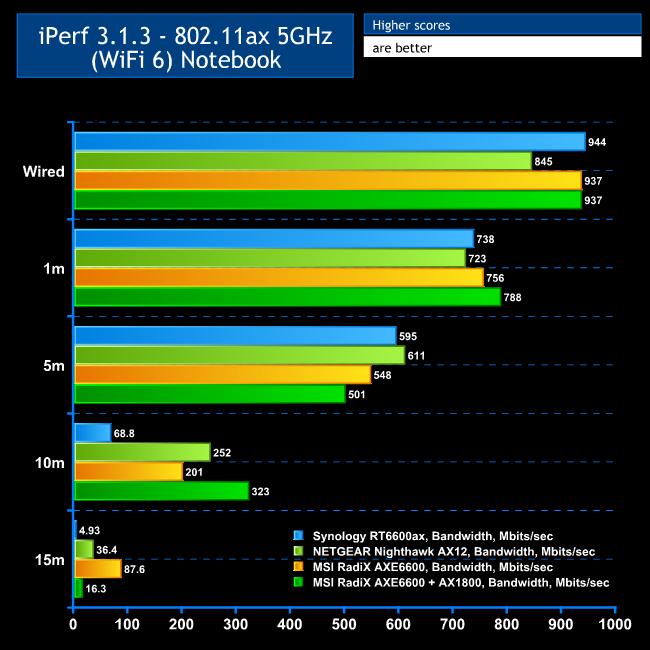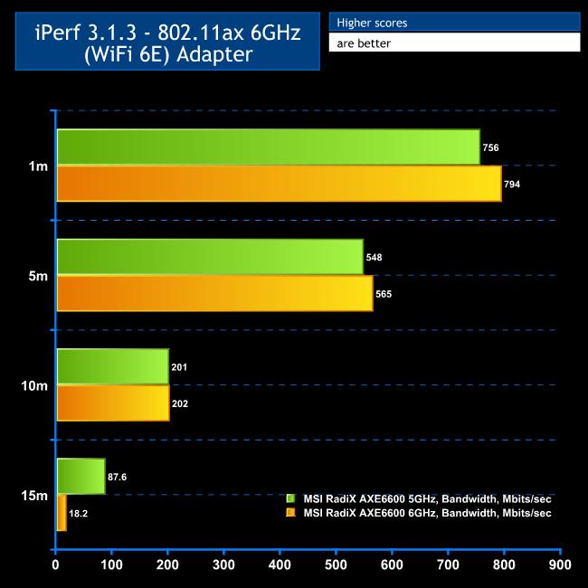 WiFi 6 performance at close range is impressive too. The RadiX beat the NETGEAR Nighthawk AX12 with 756Mbits/sec. MSI's 1800AX adapter was even more impressive, hitting 788Mbits/sec.