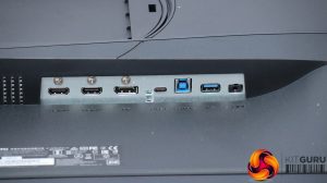 The majority of the screen's ports are at the back, facing downwards. These include two HDMI connections. Although these only support the 2.0b standard, higher levels are only necessary for higher refresh rates, which this screen doesn't offer anyway. Similarly, the single DisplayPort is only of the 1.2 variety, but that's fine for driving a 4K screen at 60Hz. The Type C connection also supports this resolution and refresh. Next along is the Type B USB upstream port, plus a single Type A USB 3.2 Gen 1 downstream port, and finally a combo audio minijack for microphone and headphones.