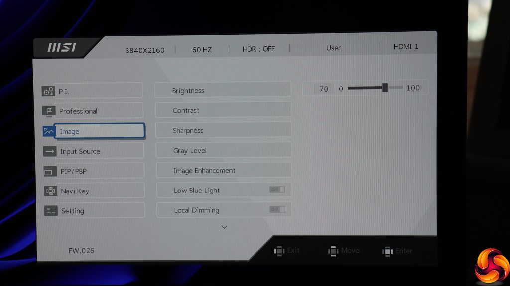 The Image section includes sundry adjustments such as brightness, contrast, sharpness and gray level. Image Enhancement is a sharpening system for edges. You can reduce the level of blue light to reduce eye strain, while local dimming increases the contrast by reducing the backlight. There are colour temperature presets from 5000K to 10000K, or you can adjust red, green and blue values separately.