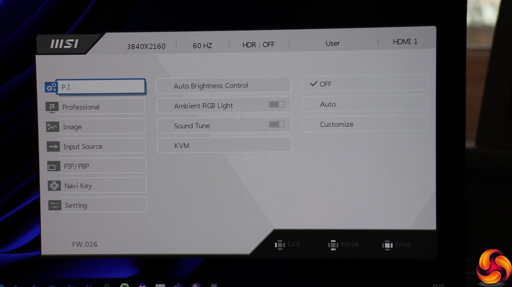 Push the joystick inwards and the main menu appears, starting with the OSD-based version of Productivity Intelligence. This enables features such as ambient light, auto brightness control, and how the KVM feature functions.