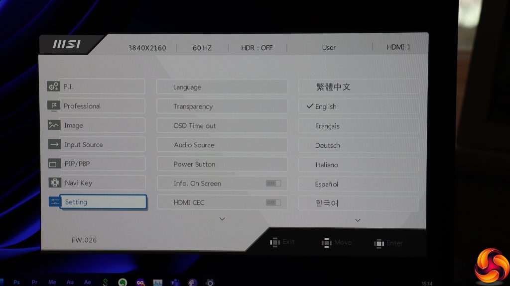 Finally, the Setting section is for altering the OSD behaviour, such as language used, transparency and time out.