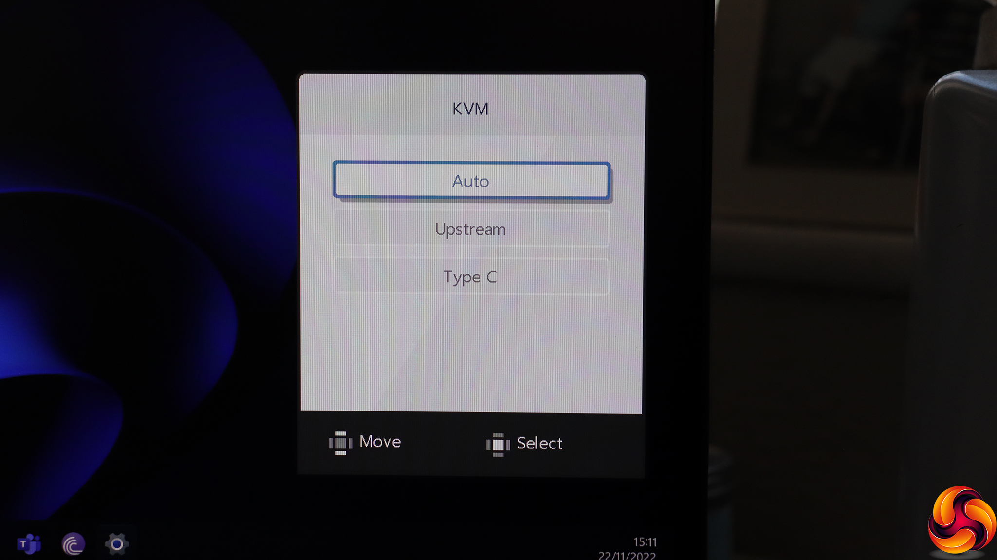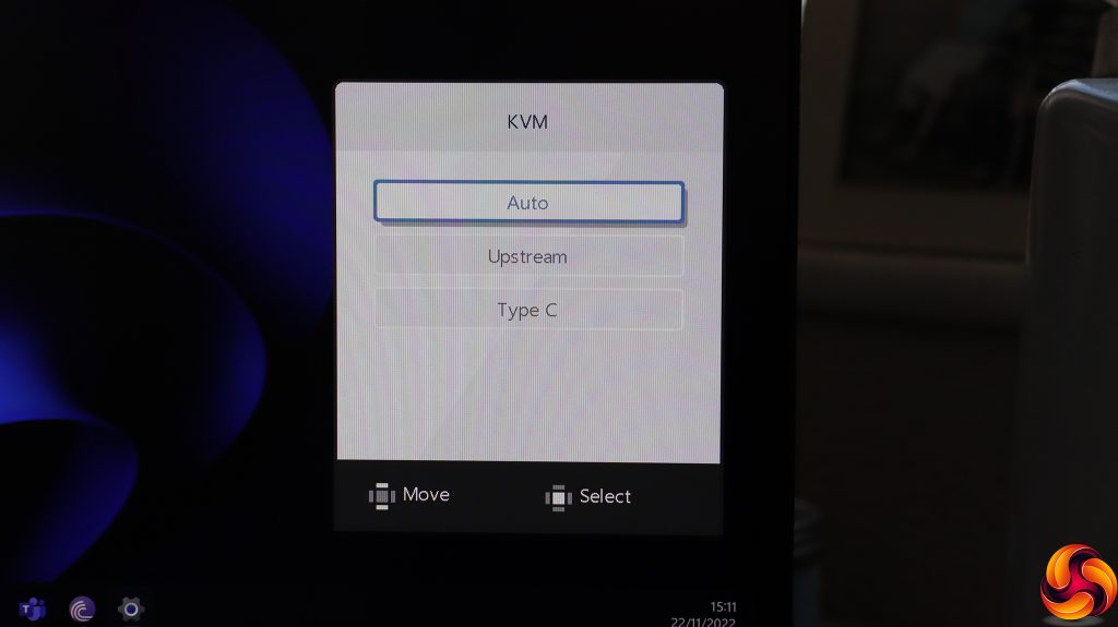 Pushing the joystick left allows you to select the KVM function, either switching the input automatically or by manually choosing the upstream Type B port or USB C.