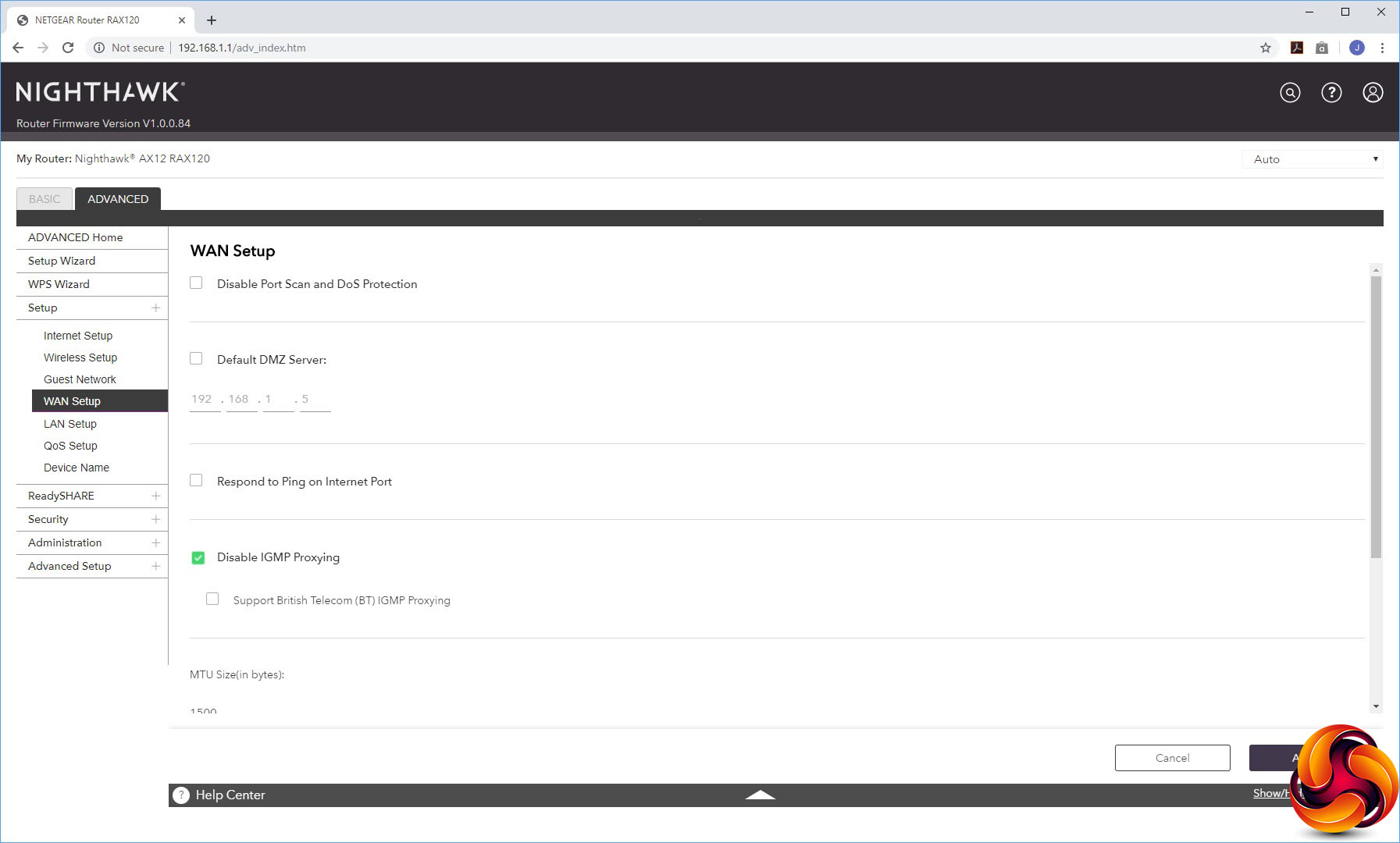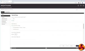 The Setup section has five different sub-sections. First comes the Internet Setup dialog, then the Wireless Setup and Guest Network option, all as found in the Basic section. The WAN Setup section lets you create a DMZ and alter other detailed options like MTU size.