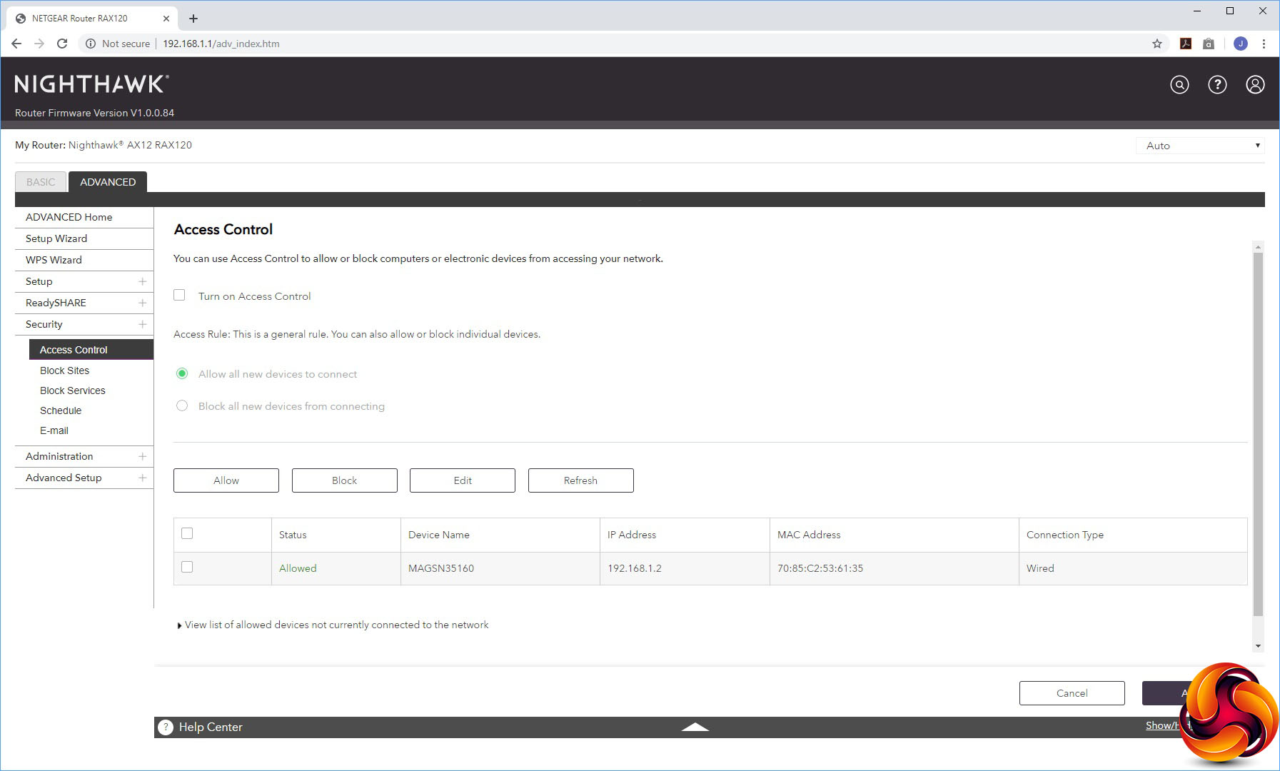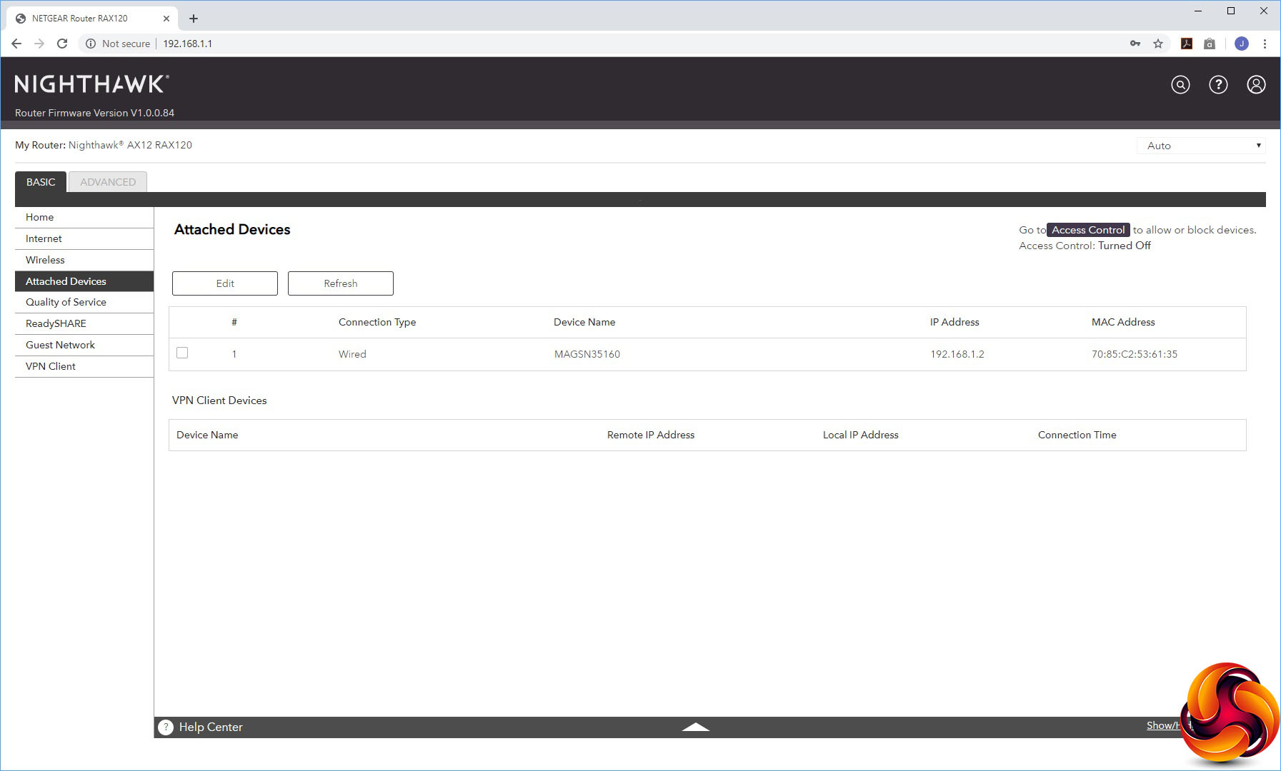 The first couple of menu options under the Basic tab let you reconfigure your Internet connection, including the option to use the 5G Ethernet port or aggregate two Gigabit ports for the WAN, and alter some basic settings for the WiFi radios. You can also view devices attached to your network, giving you the option to go to the Access Control section to block any of them.