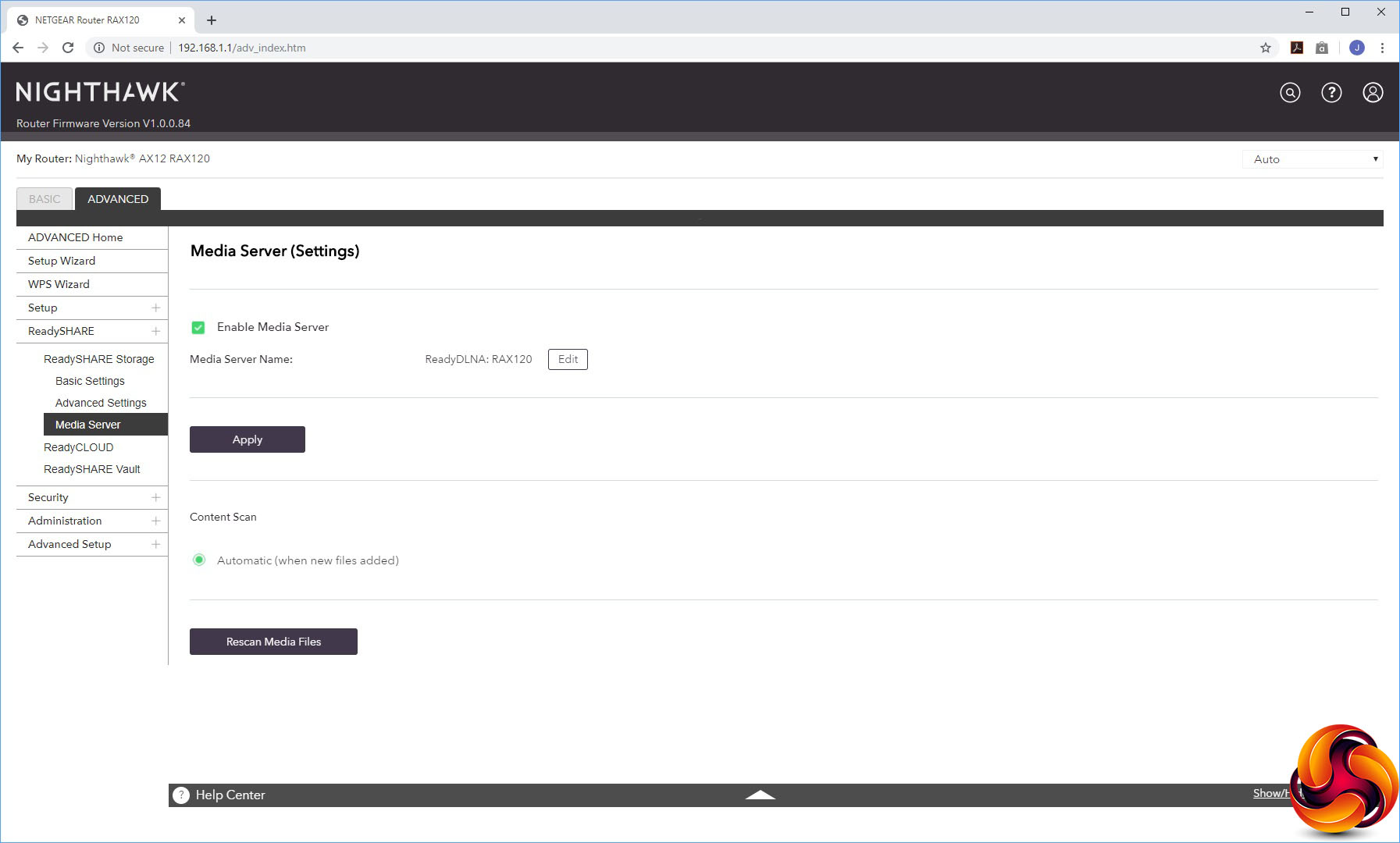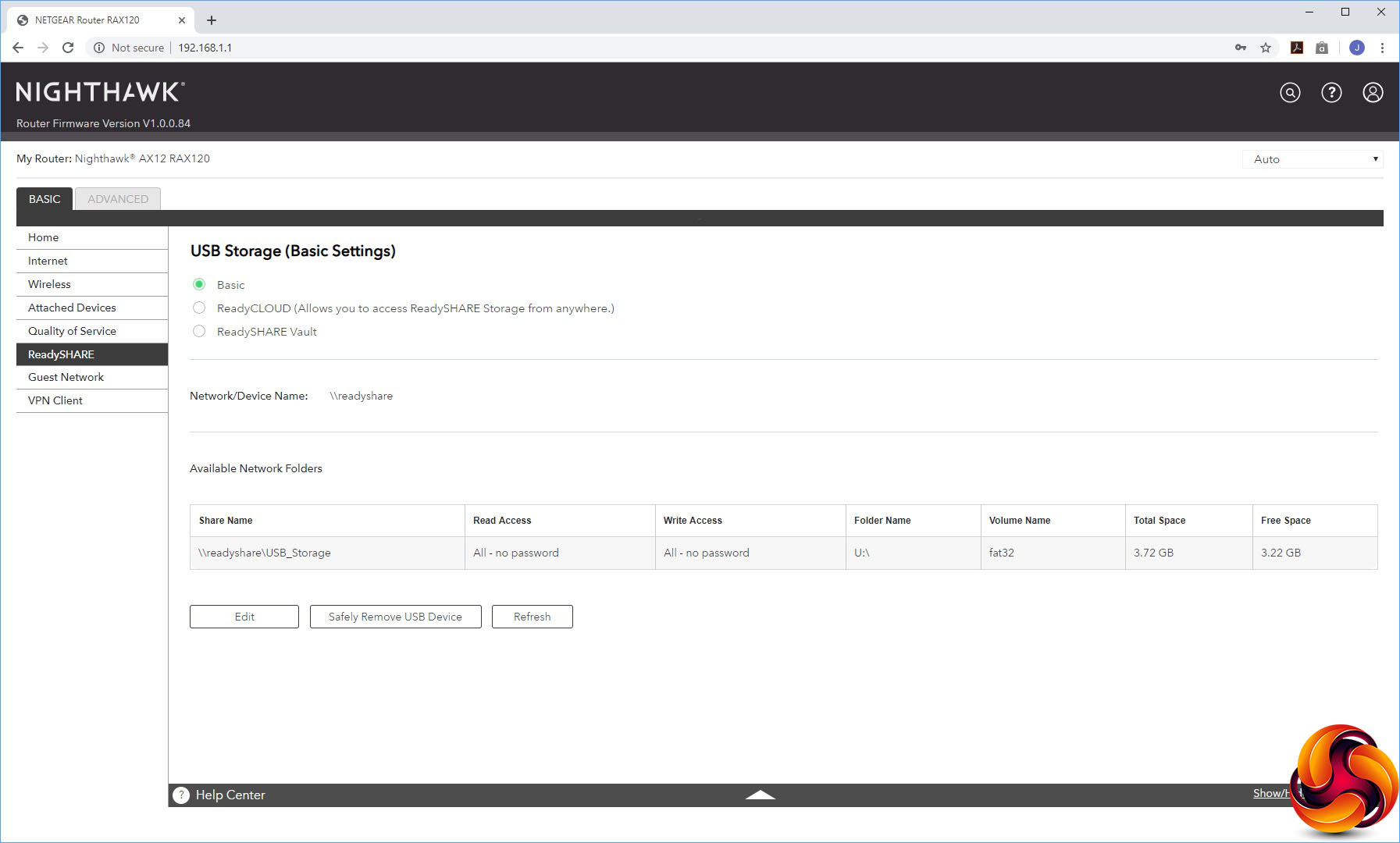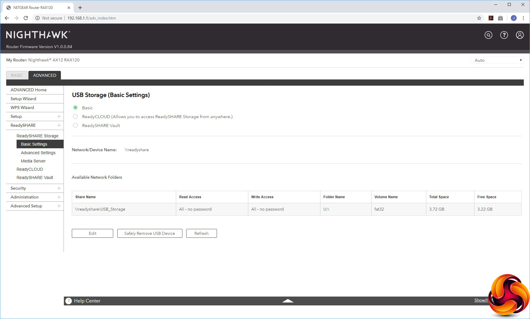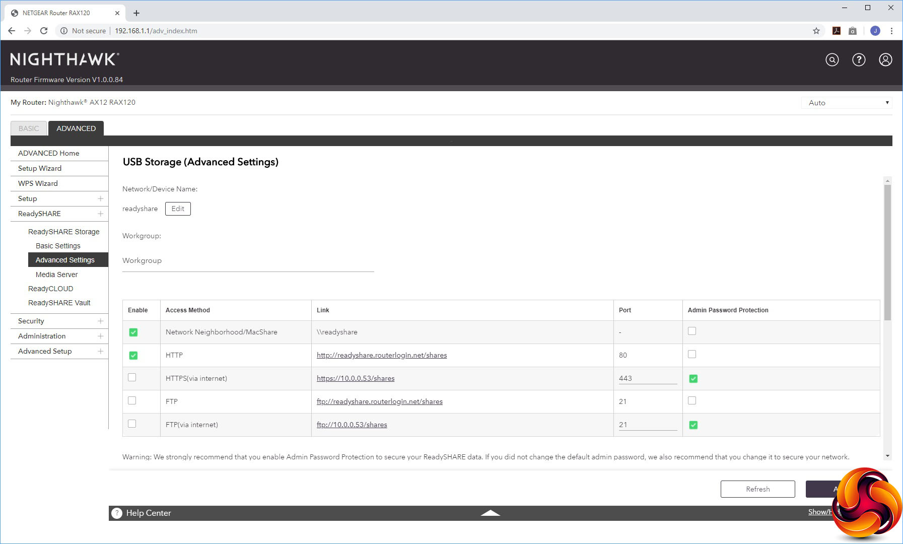 The Advanced ReadySHARE section exposes a lot more of the features for attached storage devices. You can choose whether your USB memory is presented via HTTP, HTTPS, and FTP, or just a regular Windows network file share.