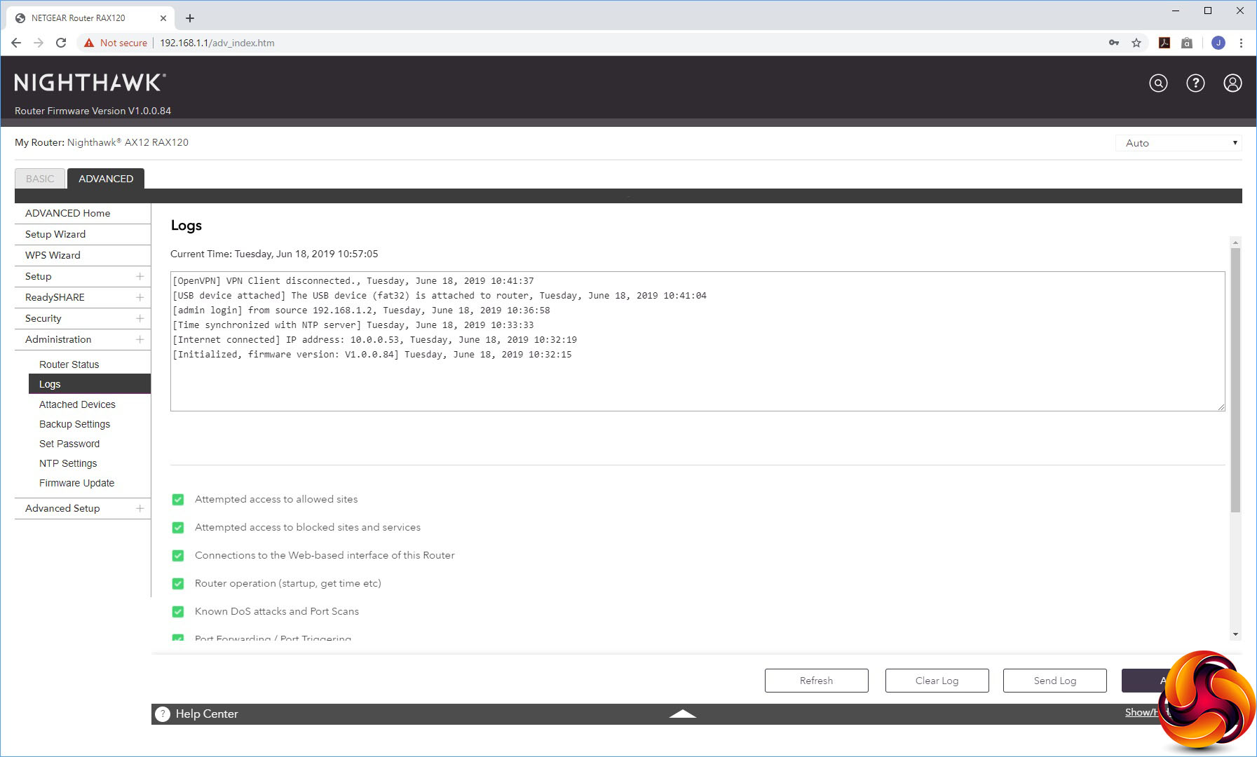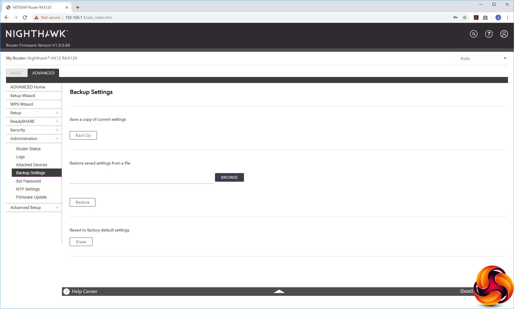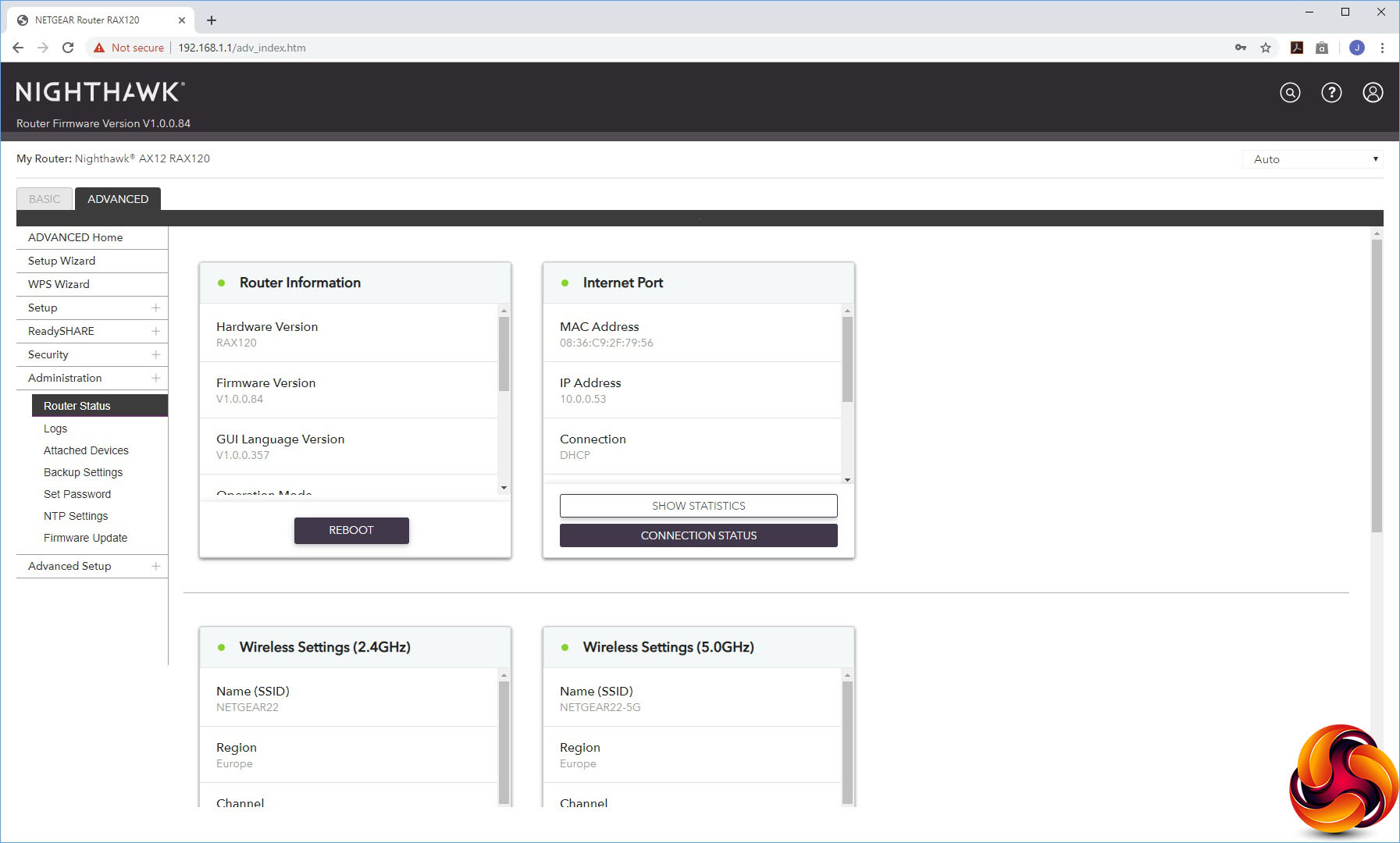 The Administration section offers sundry facilities like the status panel from the Home section, a view of activity logs, a list of attached devices, the ability to backup settings, set the admin password, configure which time server to use for setting the AX12's internal clock, and a firmware update facility.