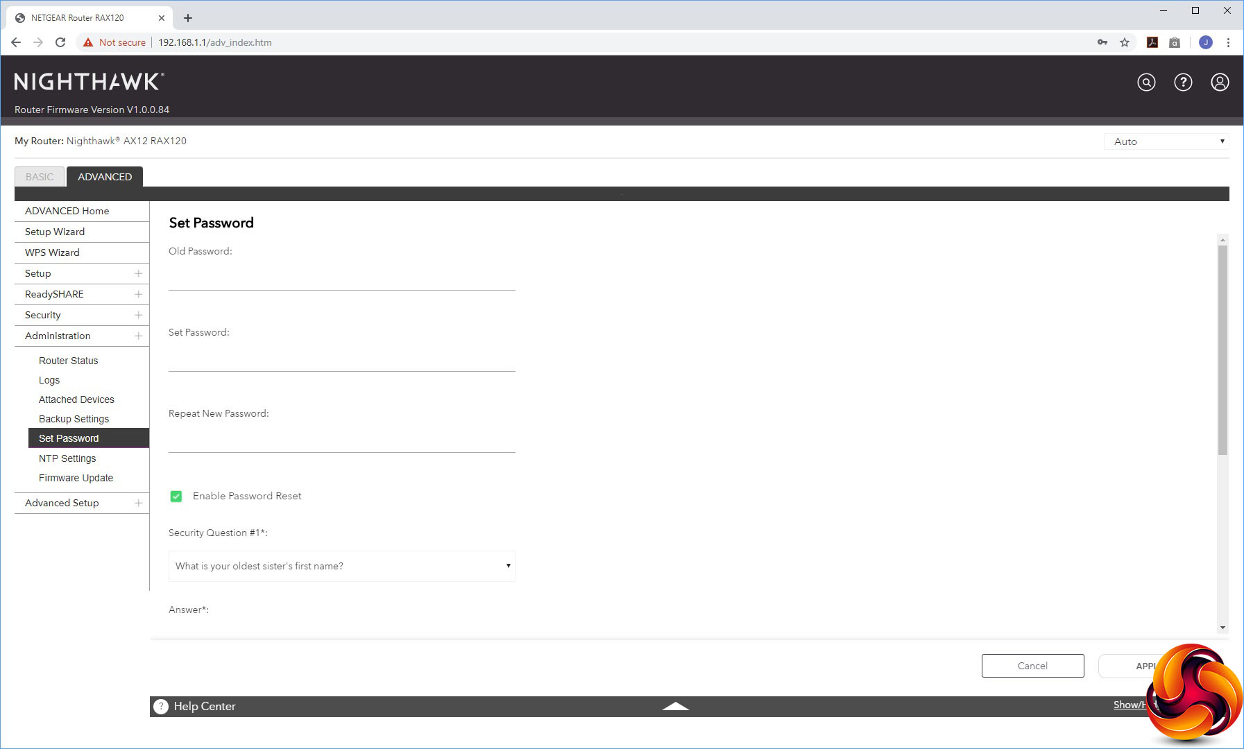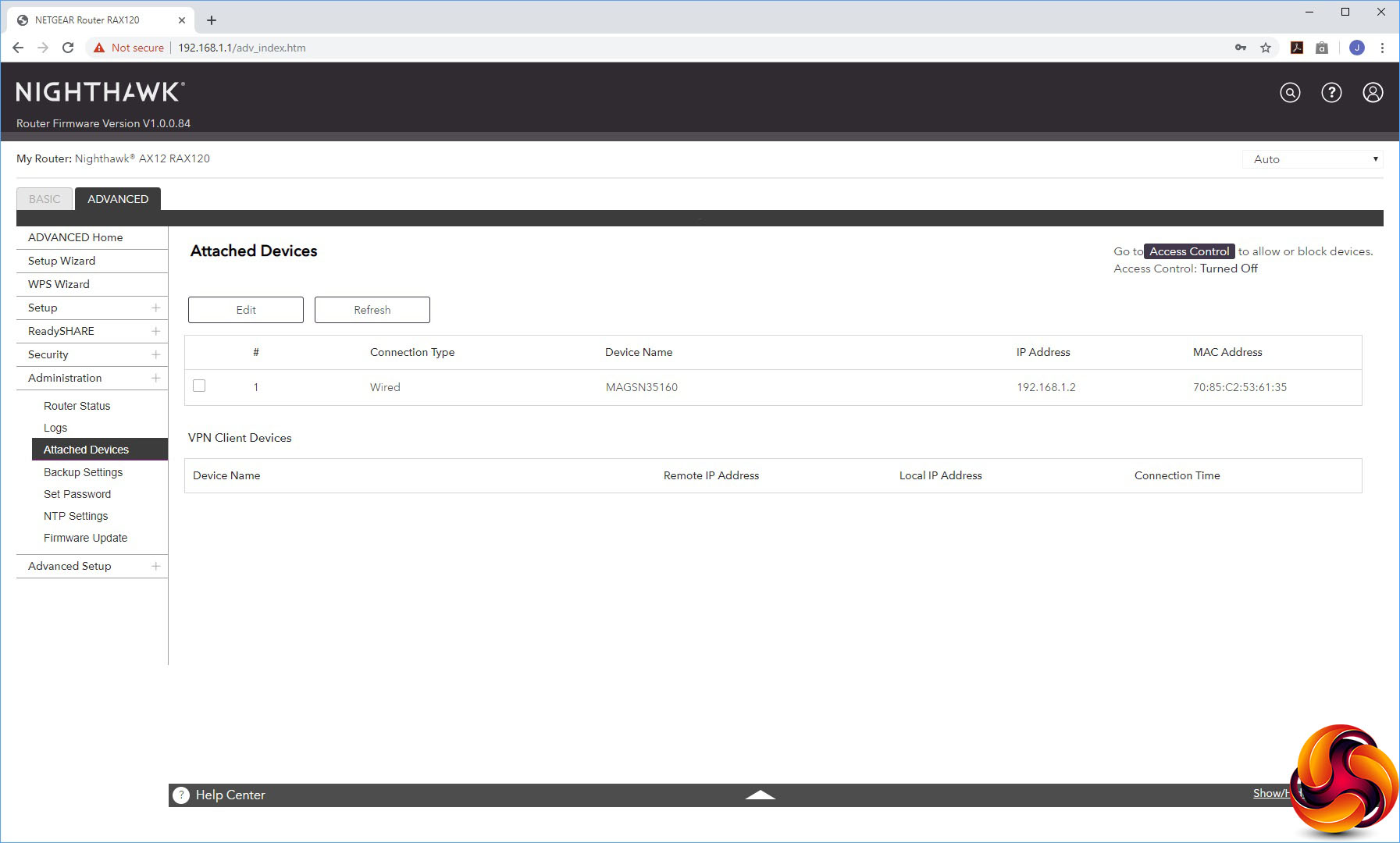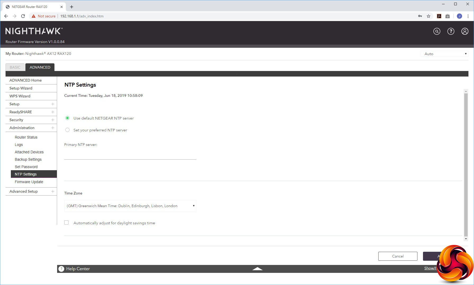 The Administration section offers sundry facilities like the status panel from the Home section, a view of activity logs, a list of attached devices, the ability to backup settings, set the admin password, configure which time server to use for setting the AX12's internal clock, and a firmware update facility.